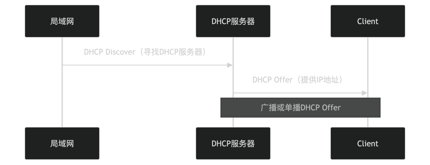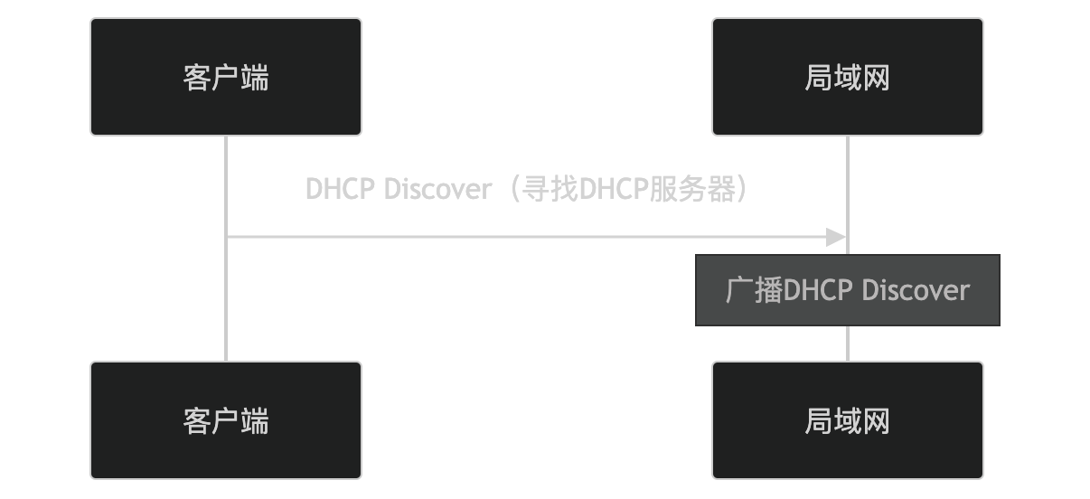 客户端广播 DHCP Discover 包,寻找可用的 DHCP 服务器。