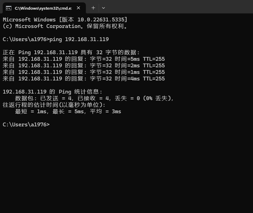 按"Win+R" 输入命令"cmd",输入 ping 加获取到的 IP,如:ping 192.168.31.119 等待打印结果。