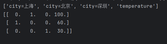 trans=DictVectorizer(sparse=False)##生成提取器对象,sparse=False表示返回的是one-hot编码的数据,不加默认是返回稀疏矩阵的形式即无0的表示方法