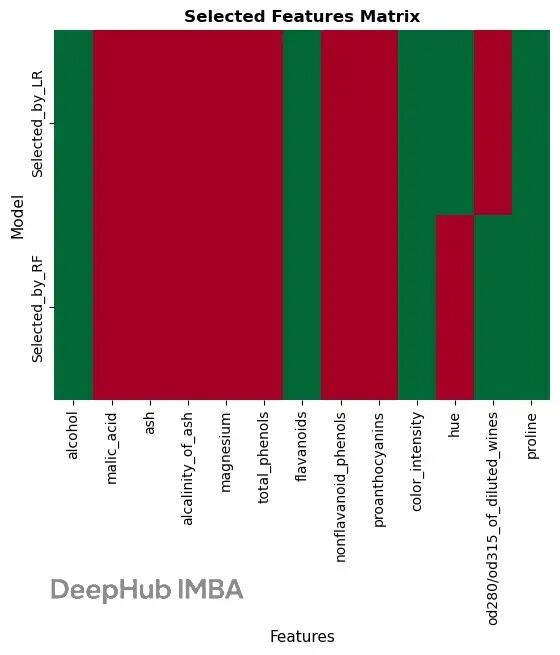 柱状图显示了各个特征在不同模型中的排名,热力图直观地展示了哪些特征被选中。可以看到 proline、flavanoids 等几个特征在两个模型中都比较重要。