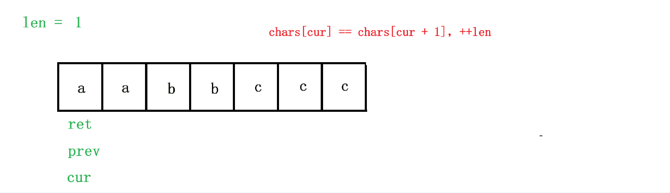 但是有一个边界情况需要注意,就是示例1,chars = ["a","a","b","b","c","c","c"] 的情况,最后字符 'c' 的情况,也就是当 cur == 6 的情况下,不仅 cur + 1 会越界,最后一个 'c' 字符也不会被添加到 ret 后面,所以最终结果是 ['a', '2', 'b', '2'],所以我们需要特殊判断一下,当 cur == chars.size() - 1 时,我们也需要将当前字符与长度插入到 chars 中。整个算法的过程如图: