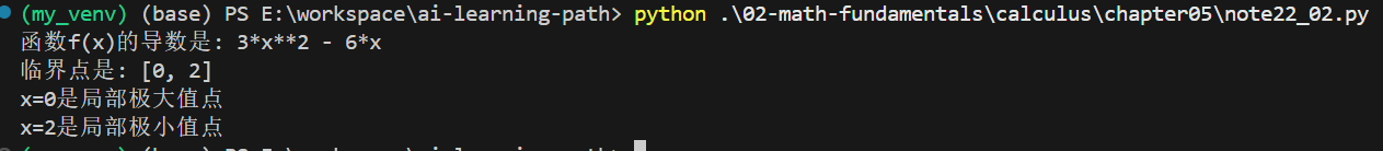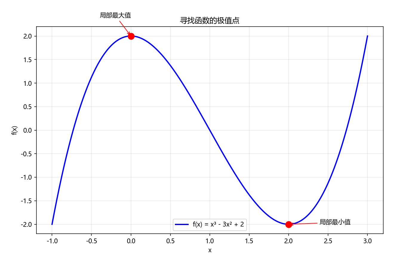 当你运行这段代码时,会看到一条蓝色曲线,上面标记了两个红点:一个是局部最大值 (山顶),一个是局部最小值(山谷)。