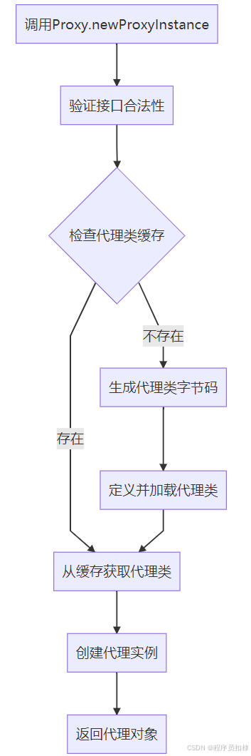 代理类查找或生成:根据接口信息生成对应的代理类。JDK会先尝试从缓存中查找,如果不存在则动态生成。