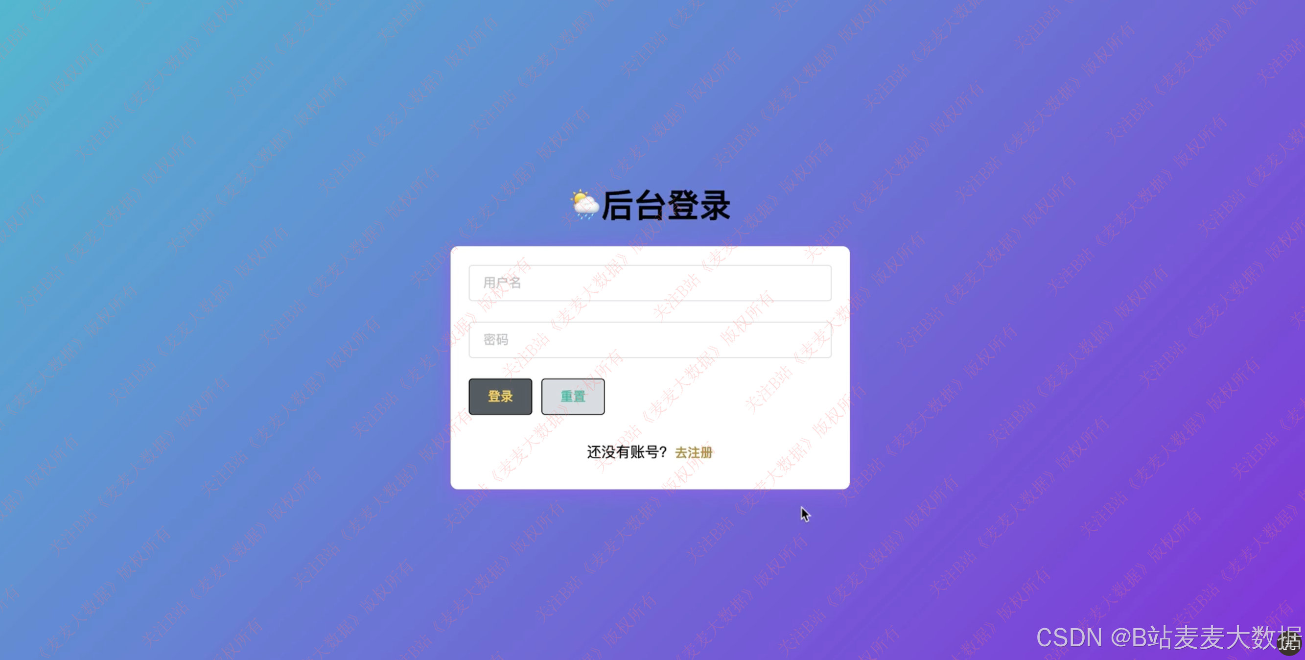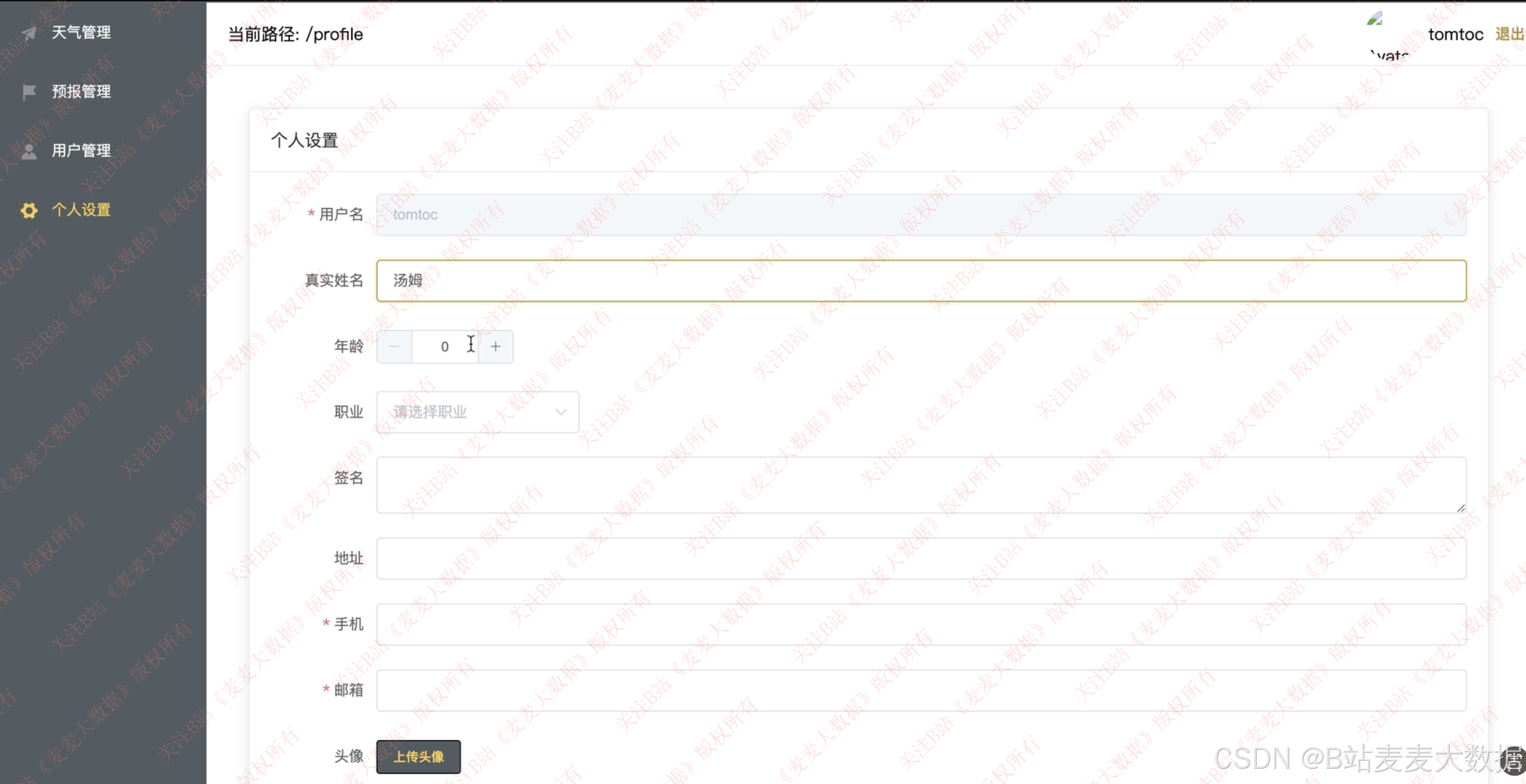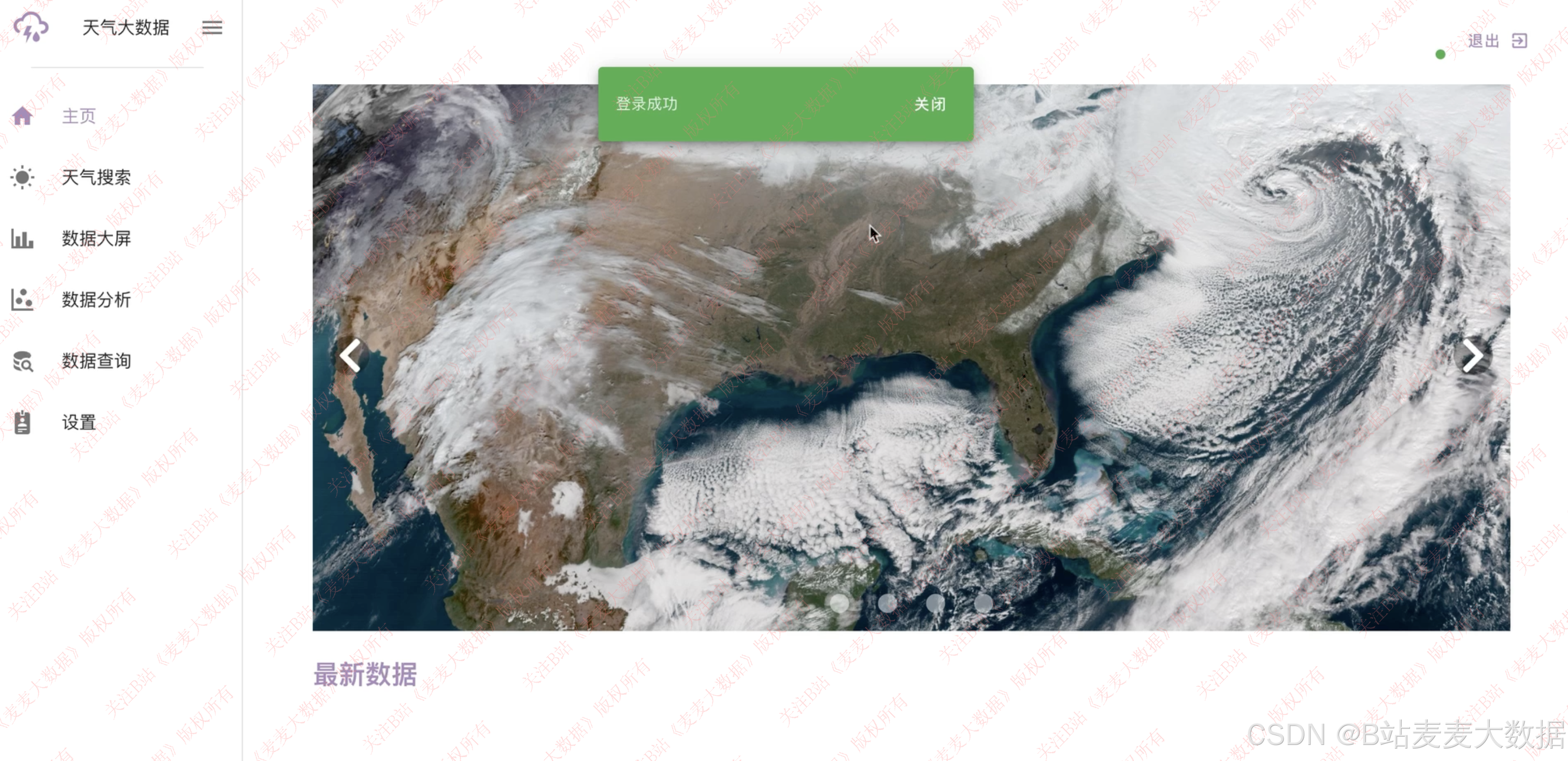 - 管理前端:面向管理员,提供天气数据管理、预报数据、用户管理等后台功能,使用 Vue + ElementUI。