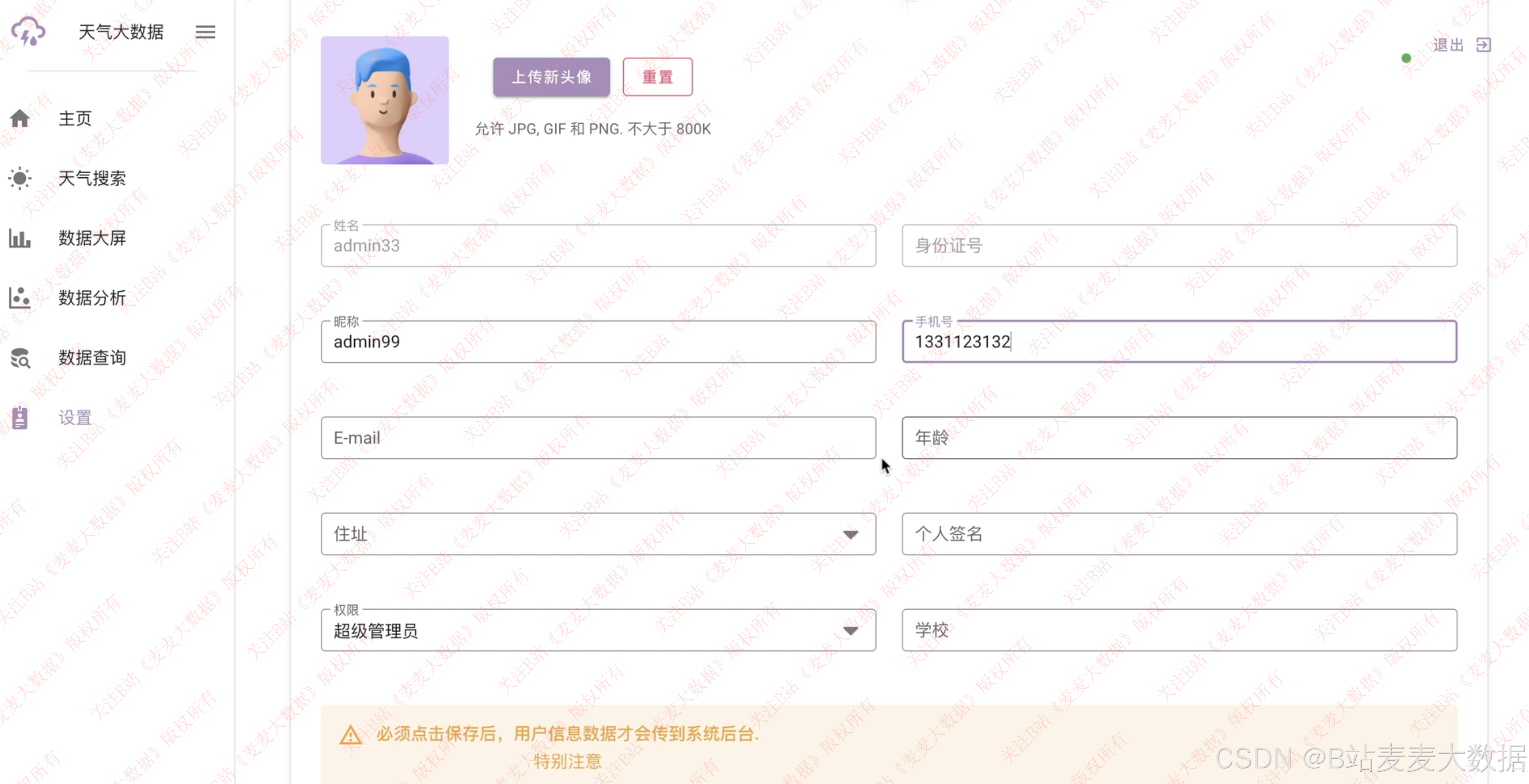 系统提供一个美观、易用的管理端界面,供管理员对系统中的城市信息、用户数据、模型参数、天气数据等进行统一管理。管理端功能包括: