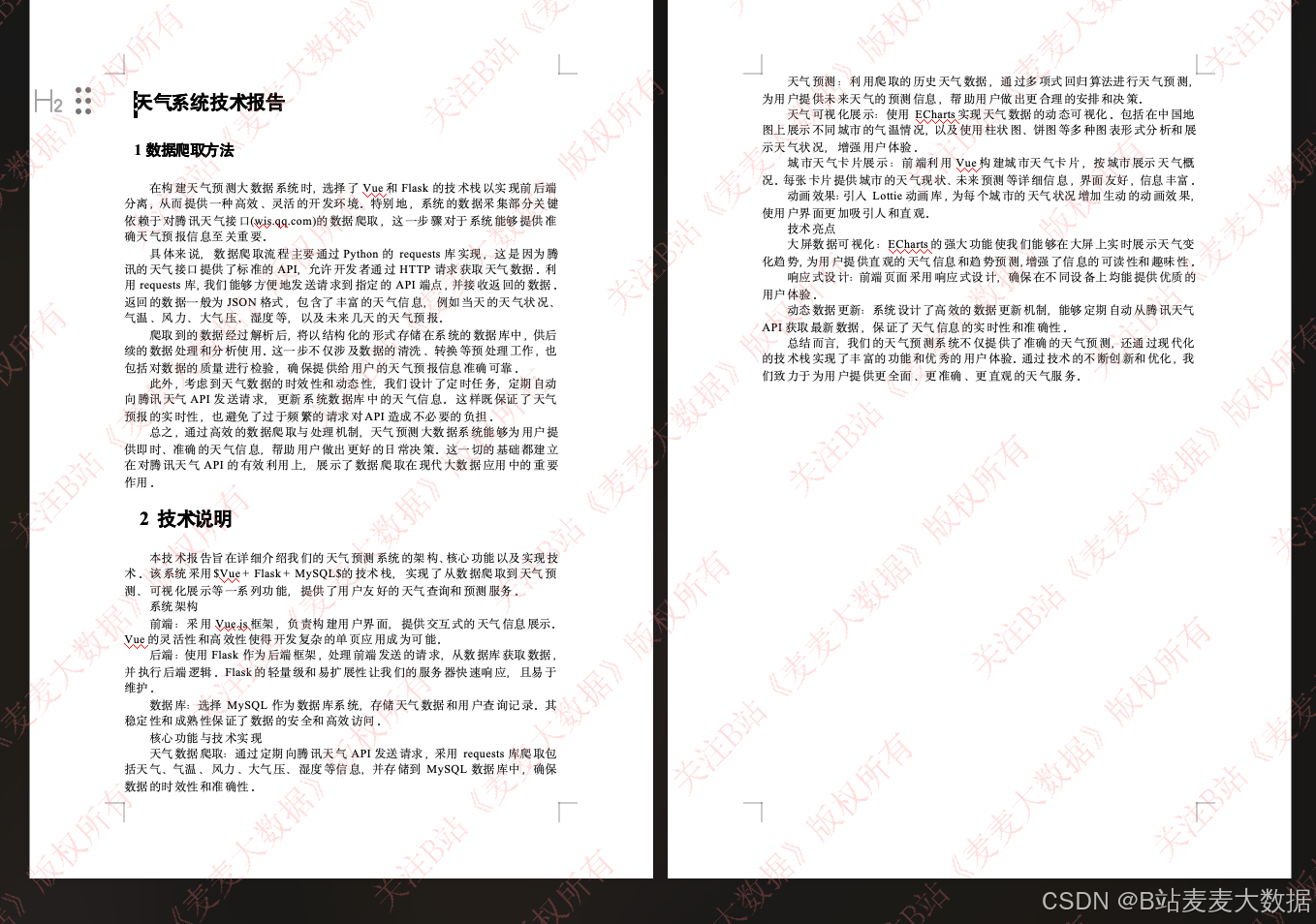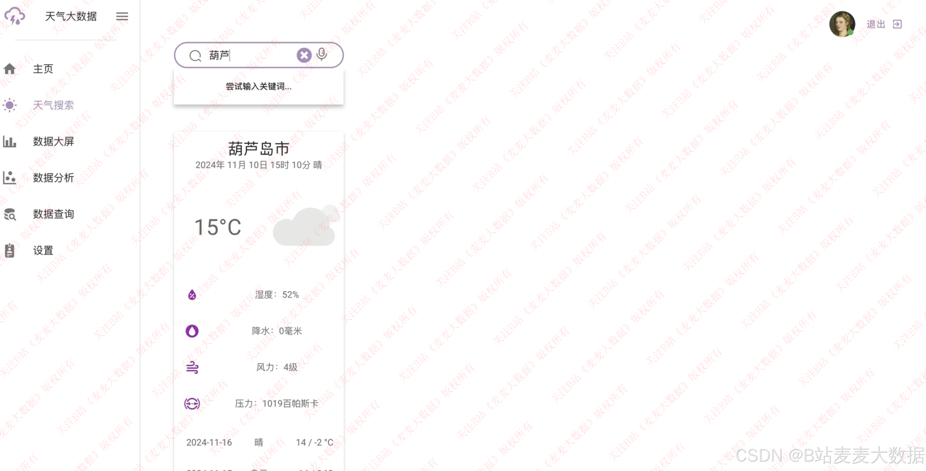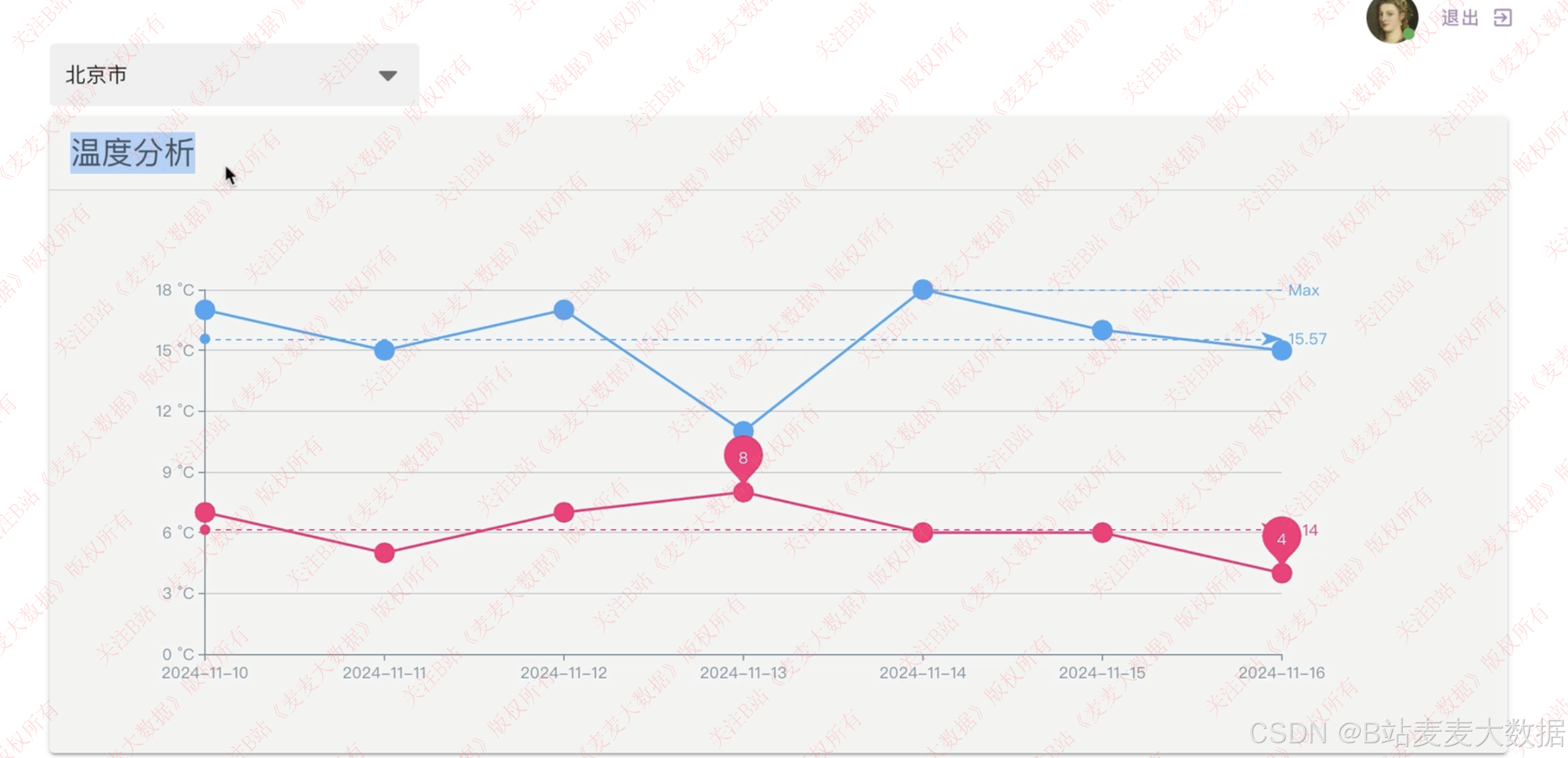 - 用户前端:面向普通用户,提供天气可视化、气温预测可视化、城市选择、地图分为、温度分析、风力分析图表展示等功能,使用 Vue + ECharts 等。