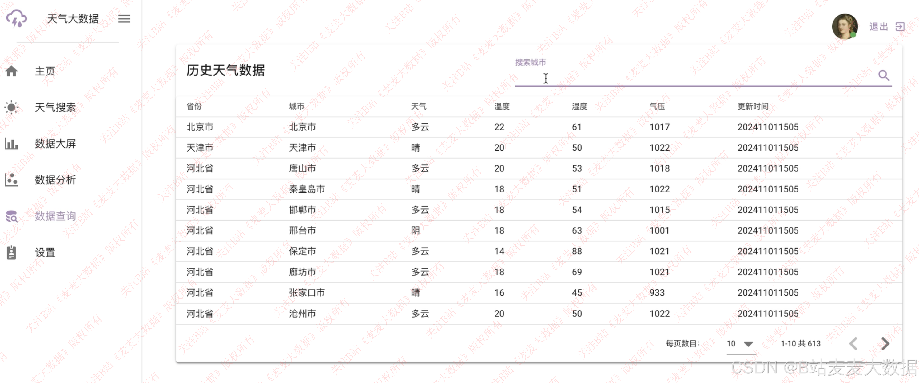 - 多维度天气数据分析,包括最高气温、最低气温、降水量、风速、风向、气压、湿度等