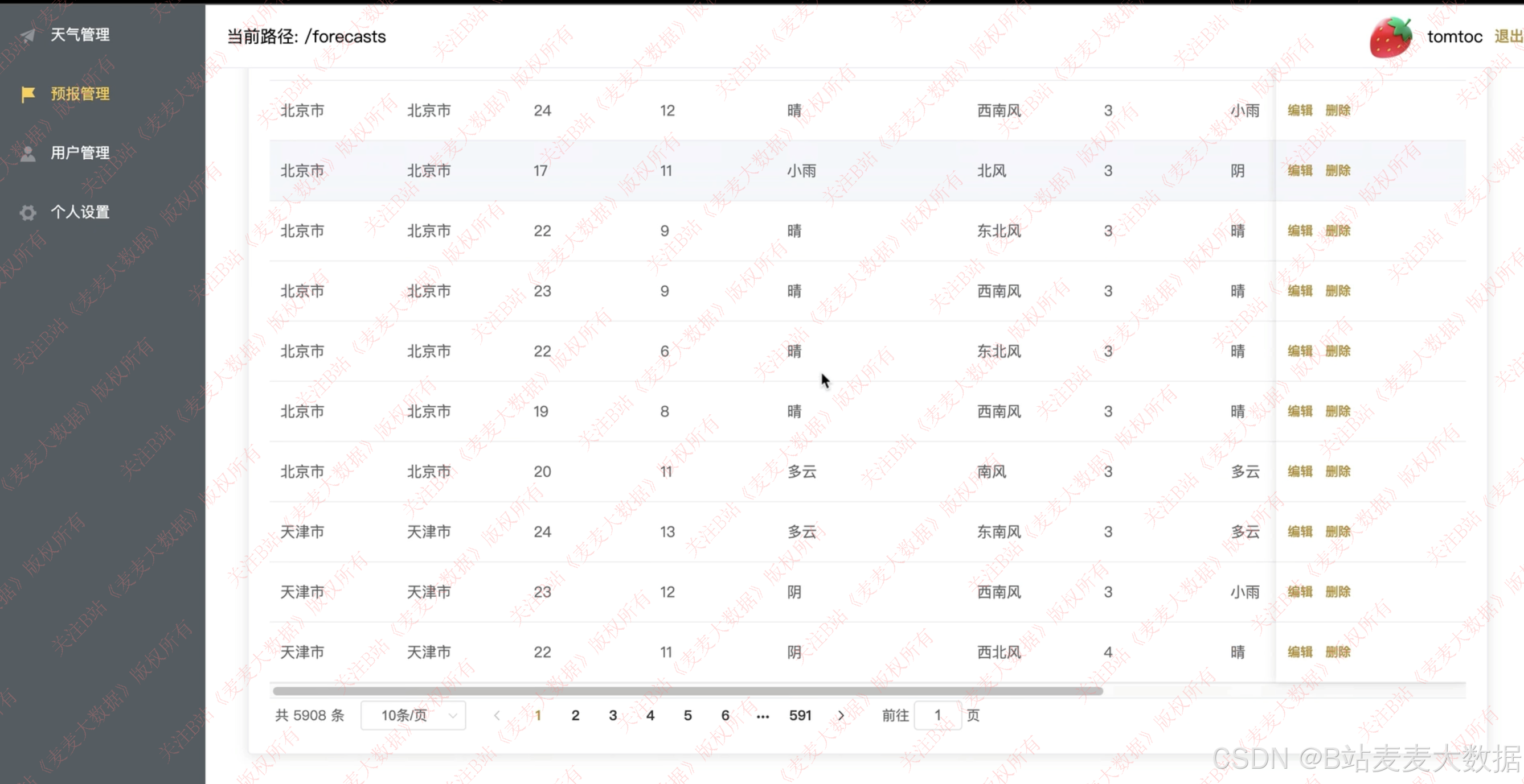系统简介:本系统是一个基于Vue+Flask构建的天气预测可视化系统,其核心功能围绕天气数据的展示、预测和用户管理展开。主要包括:首页,用于展示系统概览和天气预报视频;数据可视化模块,提供全国天气图(可视化细化到市级),并支持随意选择城市进行详细分析,如风力、 高低气温等天气要素;可视化分析模块,通过顶级可视化技术展示天气变化趋势,为用户提供直观的数据分析;天气预测模块,利用scikit-learn回归预测算法进行智能预测,为用户提供精准的天气参考;以及管理端,提供增删改查功能,以便管理员高效管理系统数据,确保系统的安全性和个性化体验。