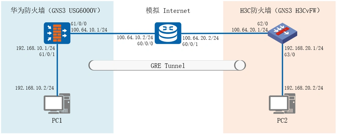 企业总部与分部分别以华为防火墙(GNS3 USG6000V)、H3C 防火墙(GNS3 H3CvFW)作为网关接入 Internet,现需在二者间搭建 GRE 隧道,以实现 192.168.10.0/24(总部内网)与 192.168.20.0/24(分部内网)的安全互通。