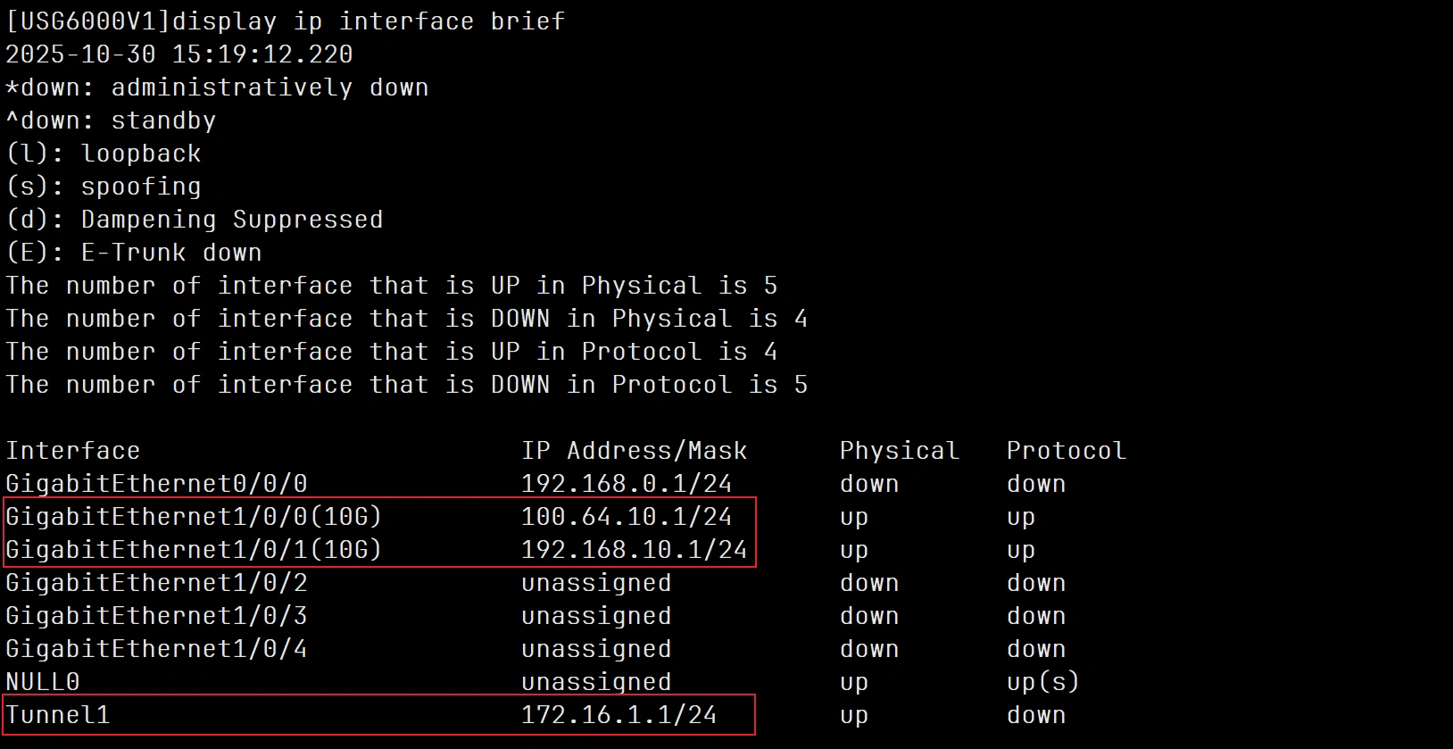 [USG6000V1-GigabitEthernet1/0/0]ip address 100.64.10.1 24