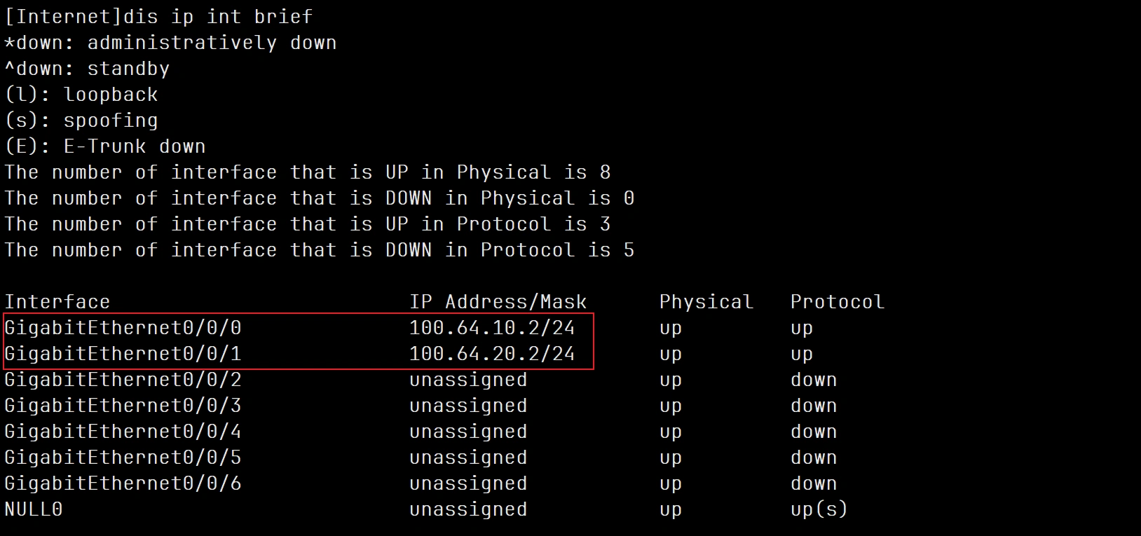 [Internet-GigabitEthernet0/0/1]ip address 100.64.10.2 24