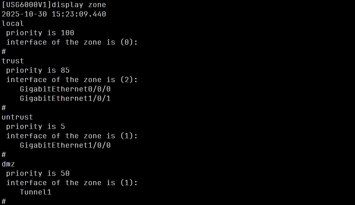 [USG6000V1-policy-security-rule-1]destination-zone dmz trust