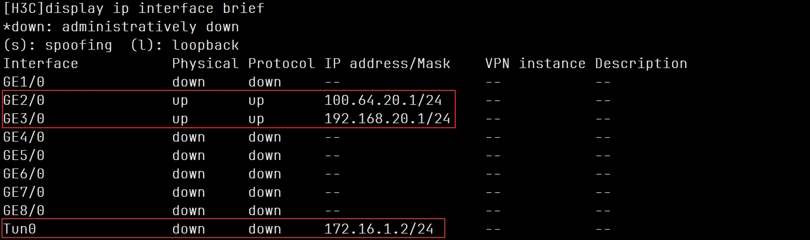 [H3C-GigabitEthernet2/0]ip address 100.64.20.1 24