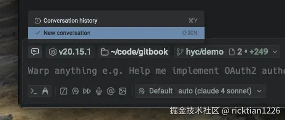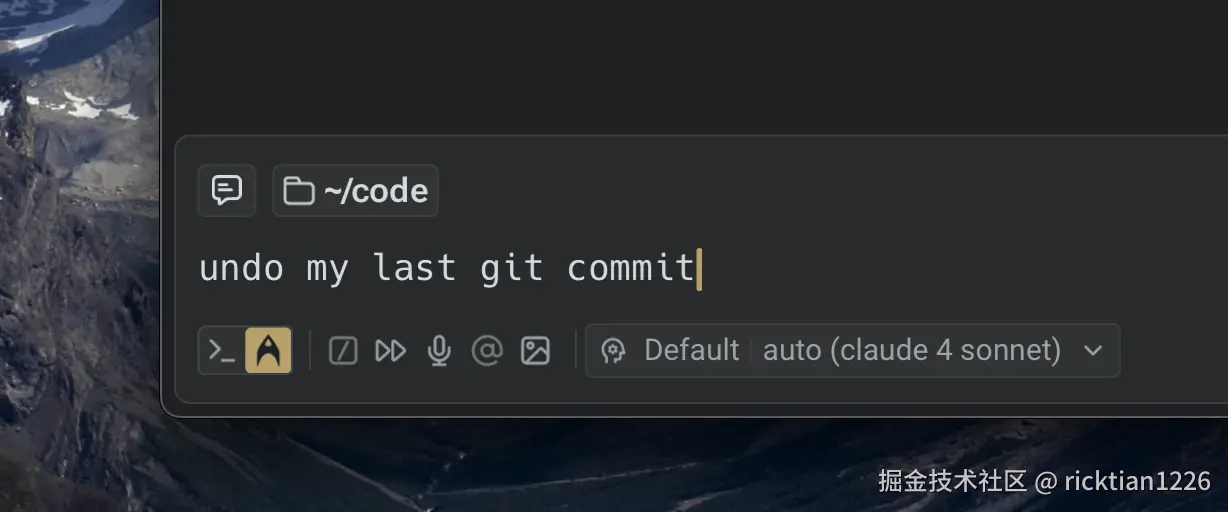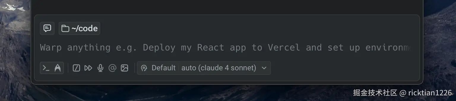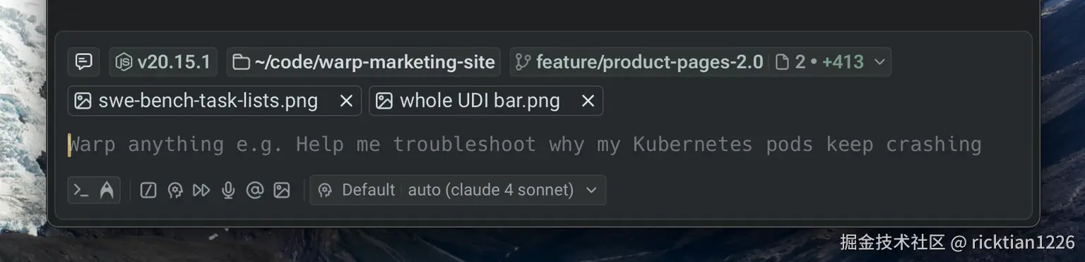 Warp会自动检测你的输入是自然语言还是shell命令。你可以保持在检测模式,也可以明确锁定到终端模式或智能体模式。