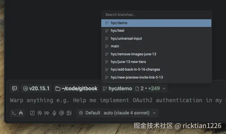 当处于一个由Git跟踪的仓库中时,Git状态块会显示文件级和行级的更改。可以通过点击分支名称来切换分支,或者在Warp的原生代码审查面板中查看已修改的文件。