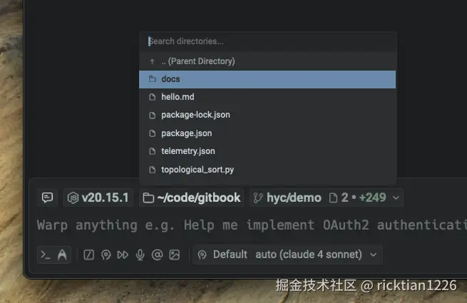 活动目录块会显示当前的工作目录,并支持简单的文件导航。点击文件夹会进入该文件夹,而点击文件则会在Warp的原生代码编辑器中打开它。这样可以从输入框内无缝地在工作区中移动。