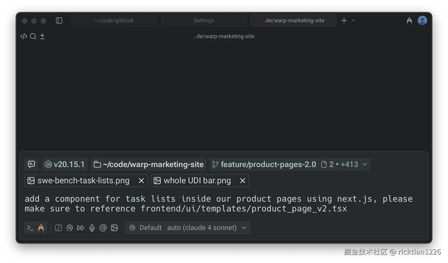Warp的通用输入功能将shell命令、智能体提示词和上下文工具整合到一个编辑器中,专为借助智能体进行现代编码而设计。