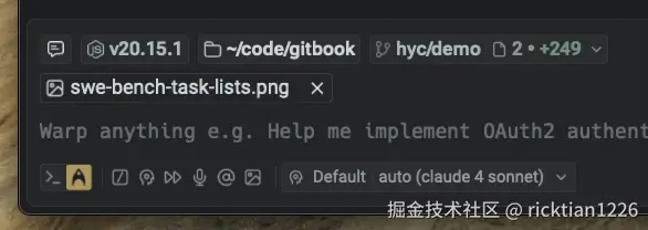 - 自然语言自动检测, Warp能够自动检测你正在输入的是纯英文而非shell命令,并切换到智能体模式。