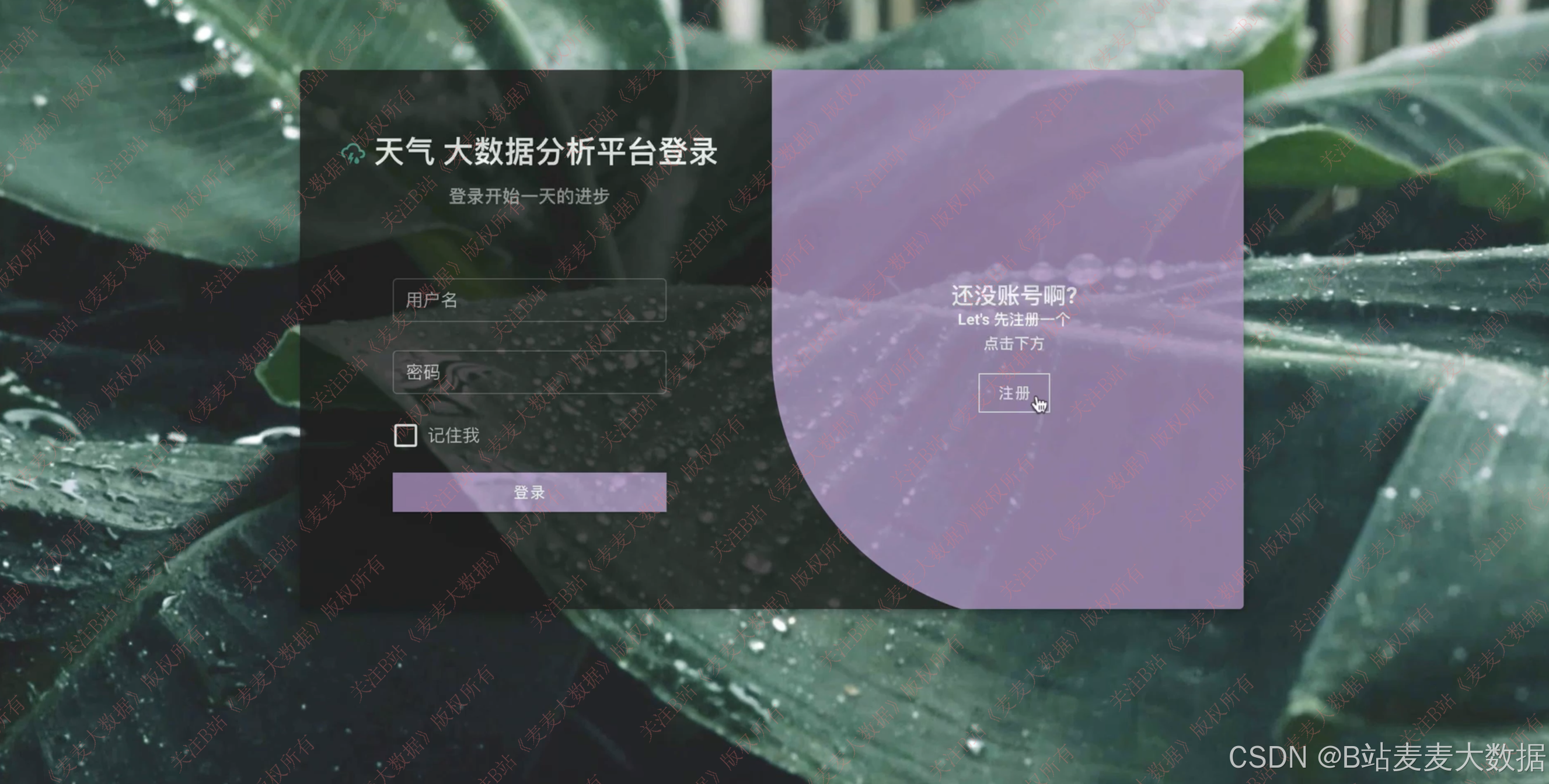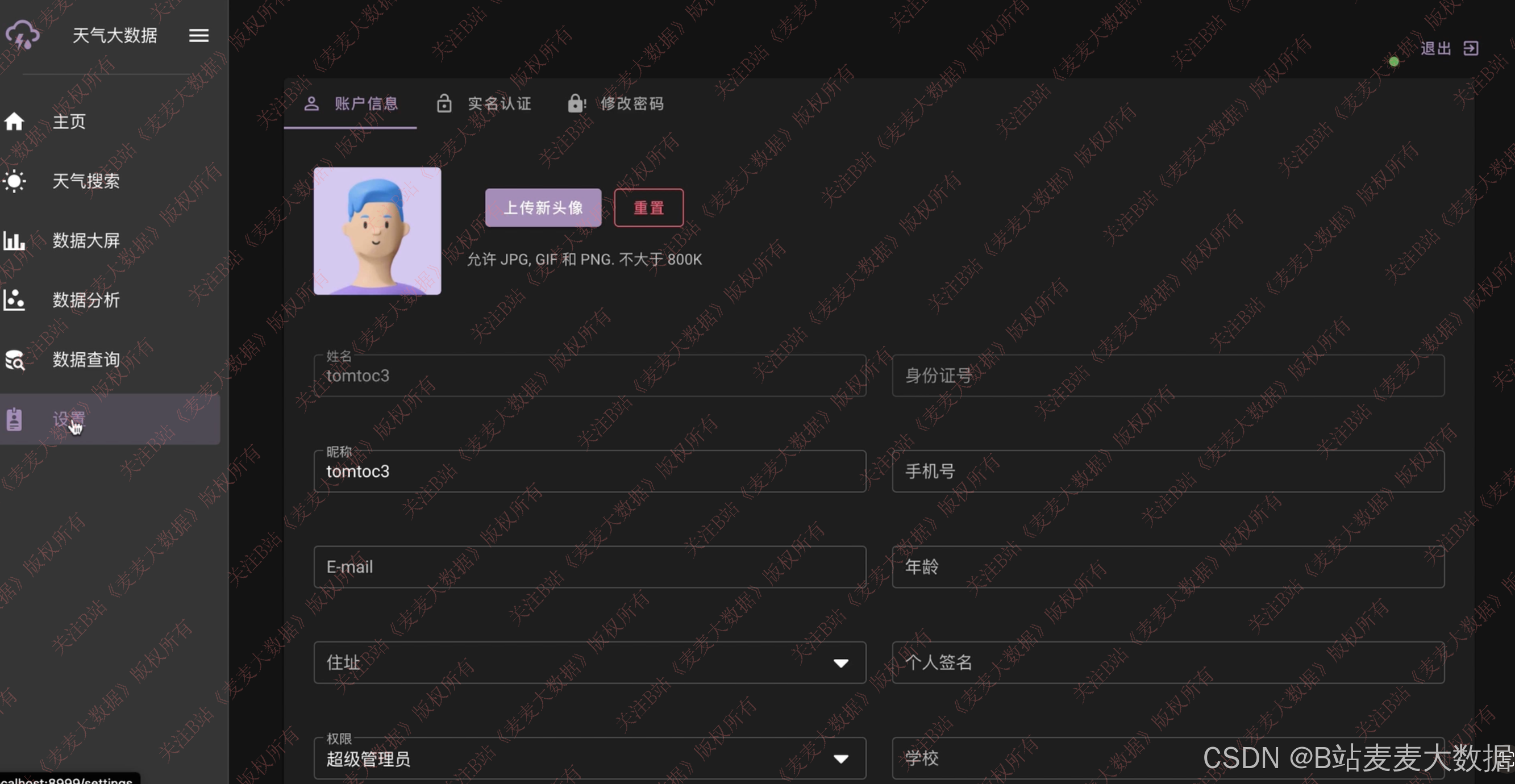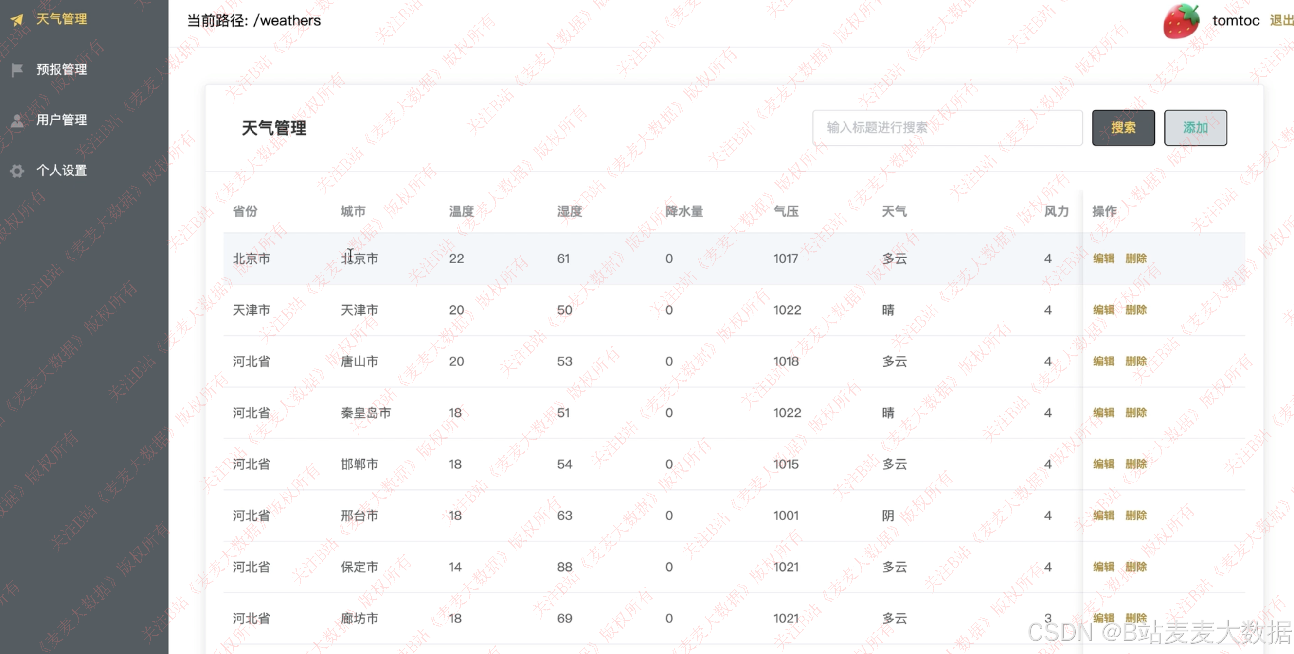 - 管理前端:面向管理员,提供天气数据管理、预报数据、用户管理等后台功能,使用 Vue + ElementUI。