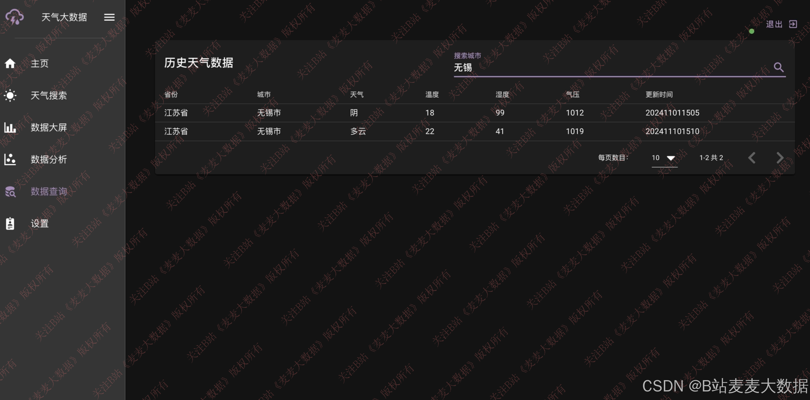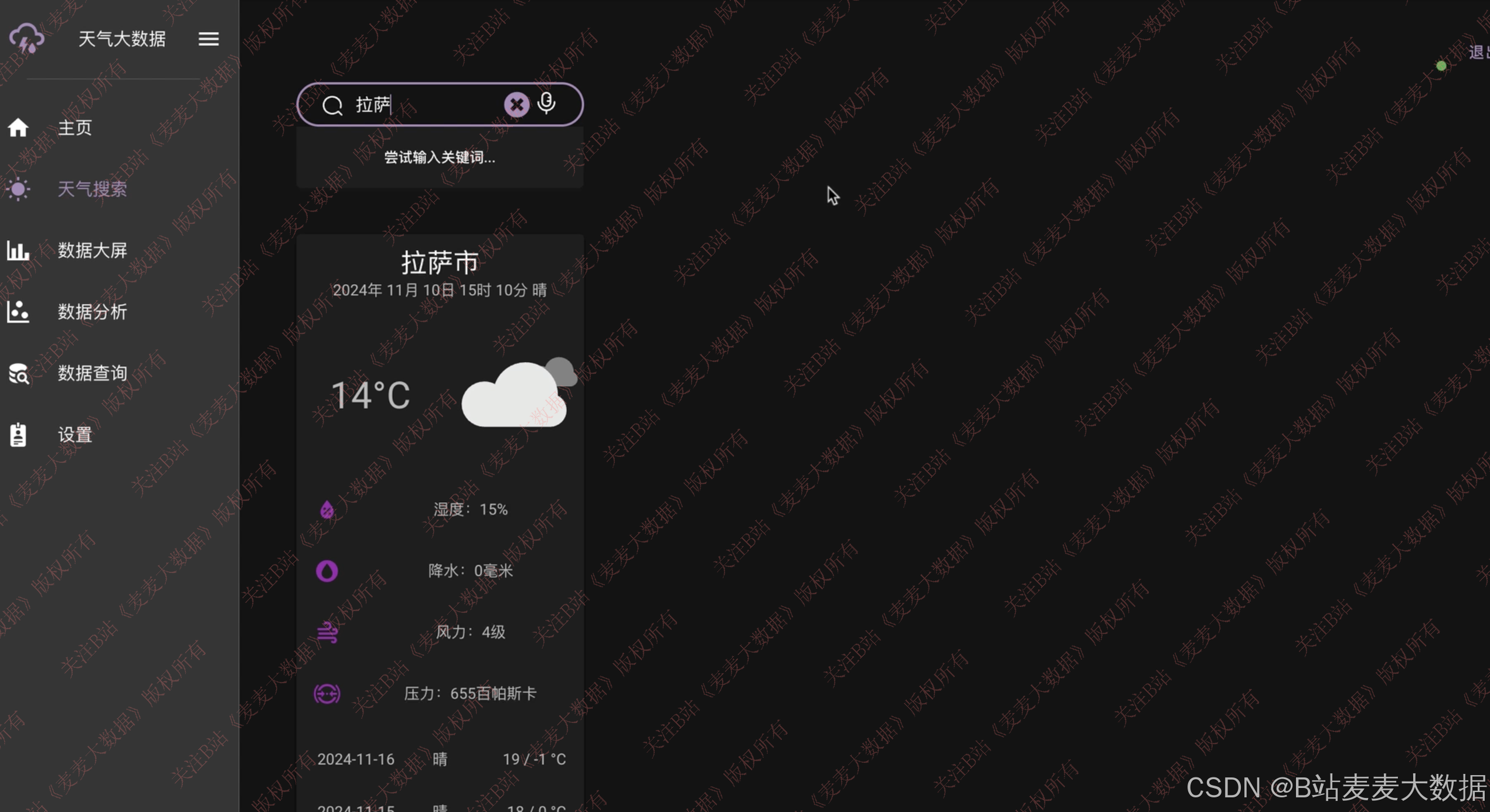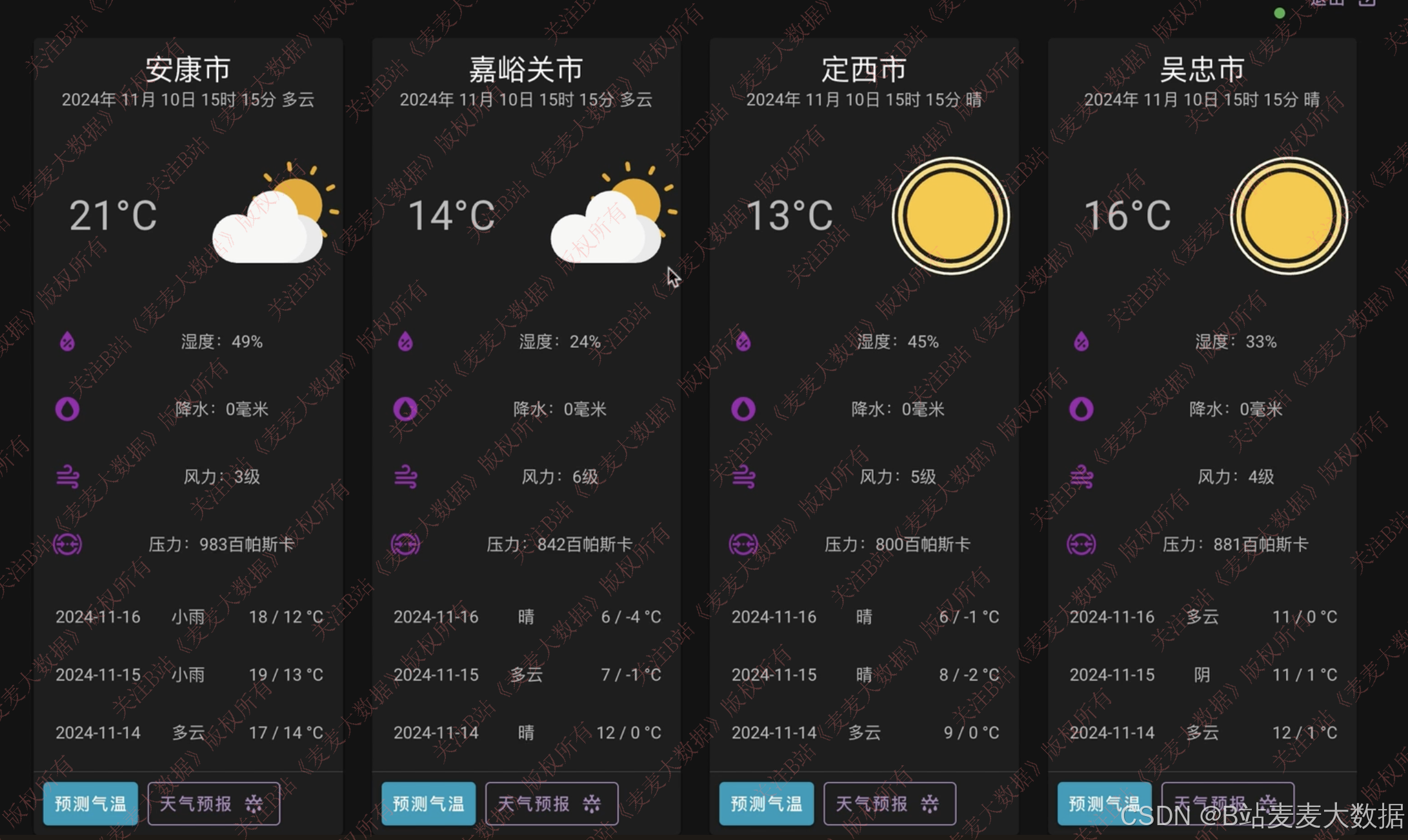 - 多维度天气数据分析,包括最高气温、最低气温、降水量、风速、风向、气压、湿度等