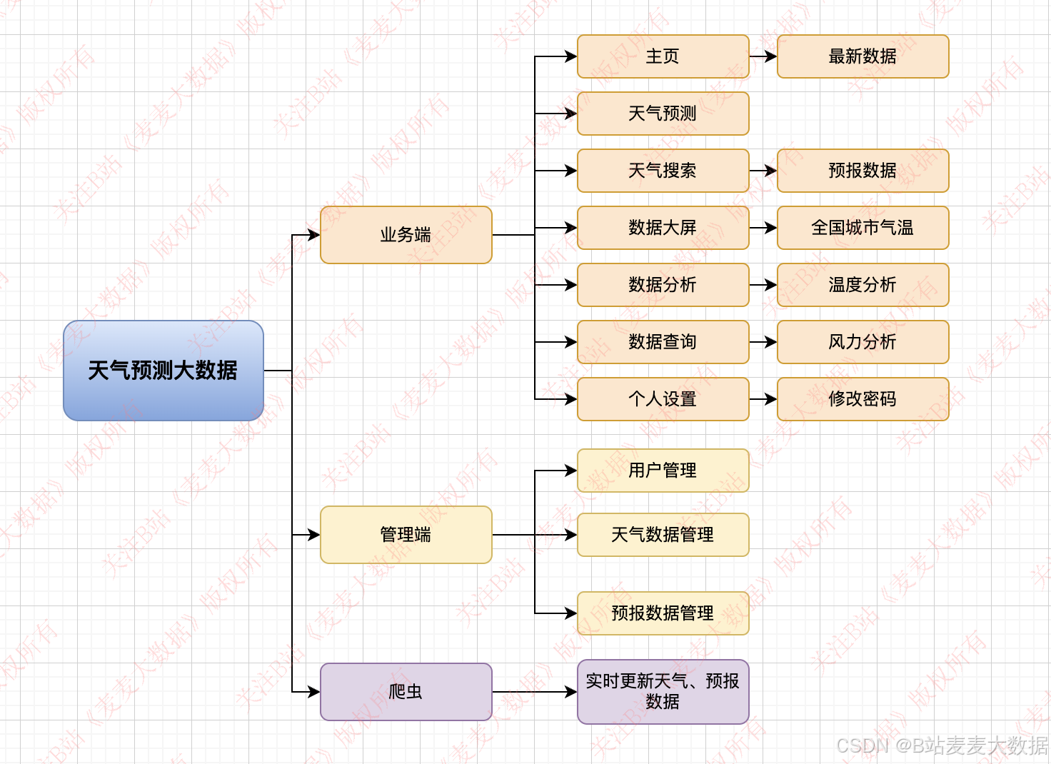本系统旨在打造一个高效、直观、功能全面的全国天气预测与可视化分析平台,结合前沿的数据爬取、机器学习预测和前后端分离架构,为用户提供精准的天气信息与灵活的交互体验。系统整体设计围绕"数据驱动 + 智能预测 + 可视化呈现 "三大核心展开,力求实现"较好 "的可视化效果和"方便管理天气数据"的管理体验。