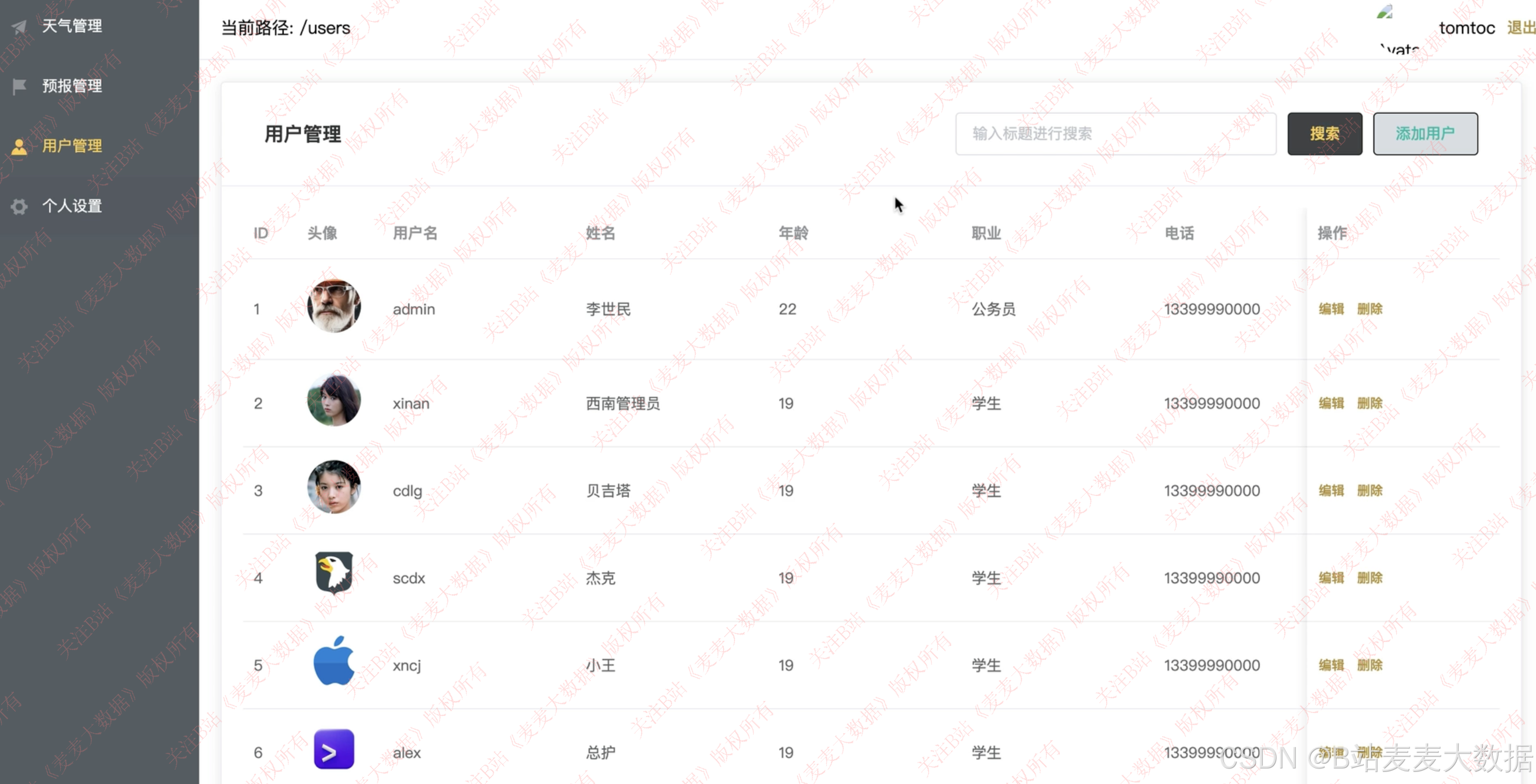 系统提供一个美观、易用的管理端界面,供管理员对系统中的城市信息、用户数据、模型参数、天气数据等进行统一管理。管理端功能包括: