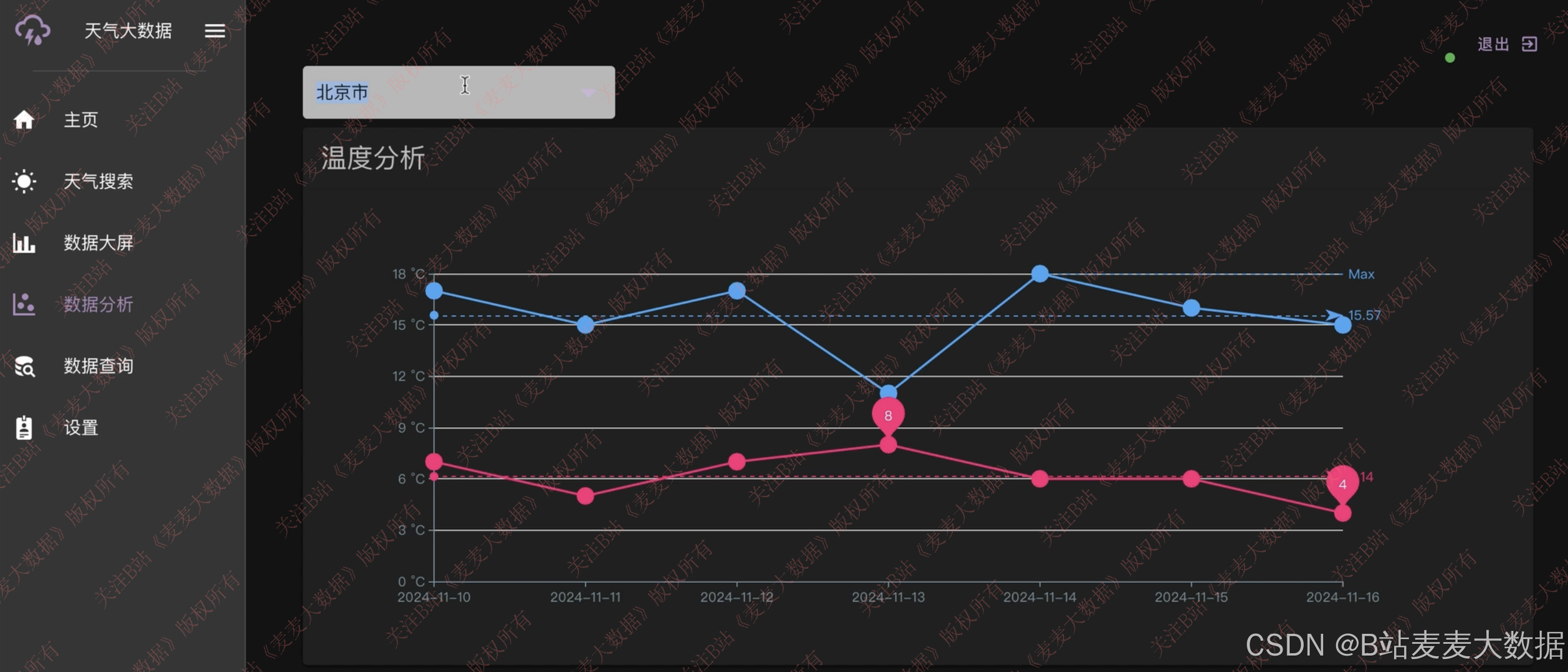 - 用户前端:面向普通用户,提供天气可视化、气温预测可视化、城市选择、地图分为、温度分析、风力分析图表展示等功能,使用 Vue + ECharts 等。