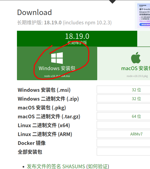 1、下载windows版本nodejs及安装