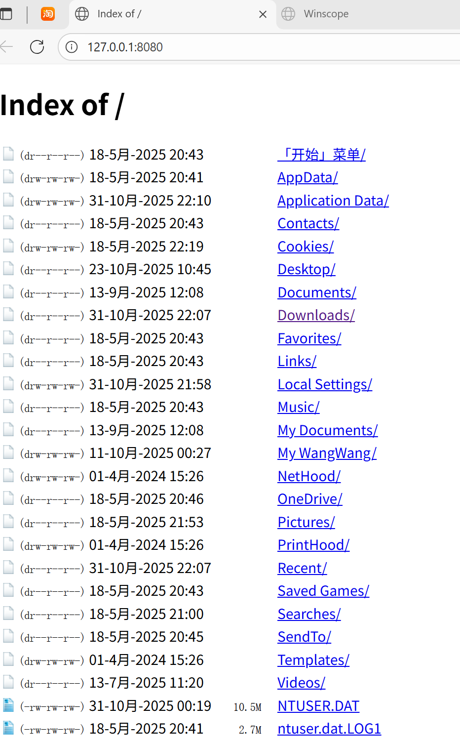 启动后,一定要使用chrome浏览器输入127.0.0.1:8080会类似如下本地文件界面,一路点击到自己离线html的文件夹prop路径