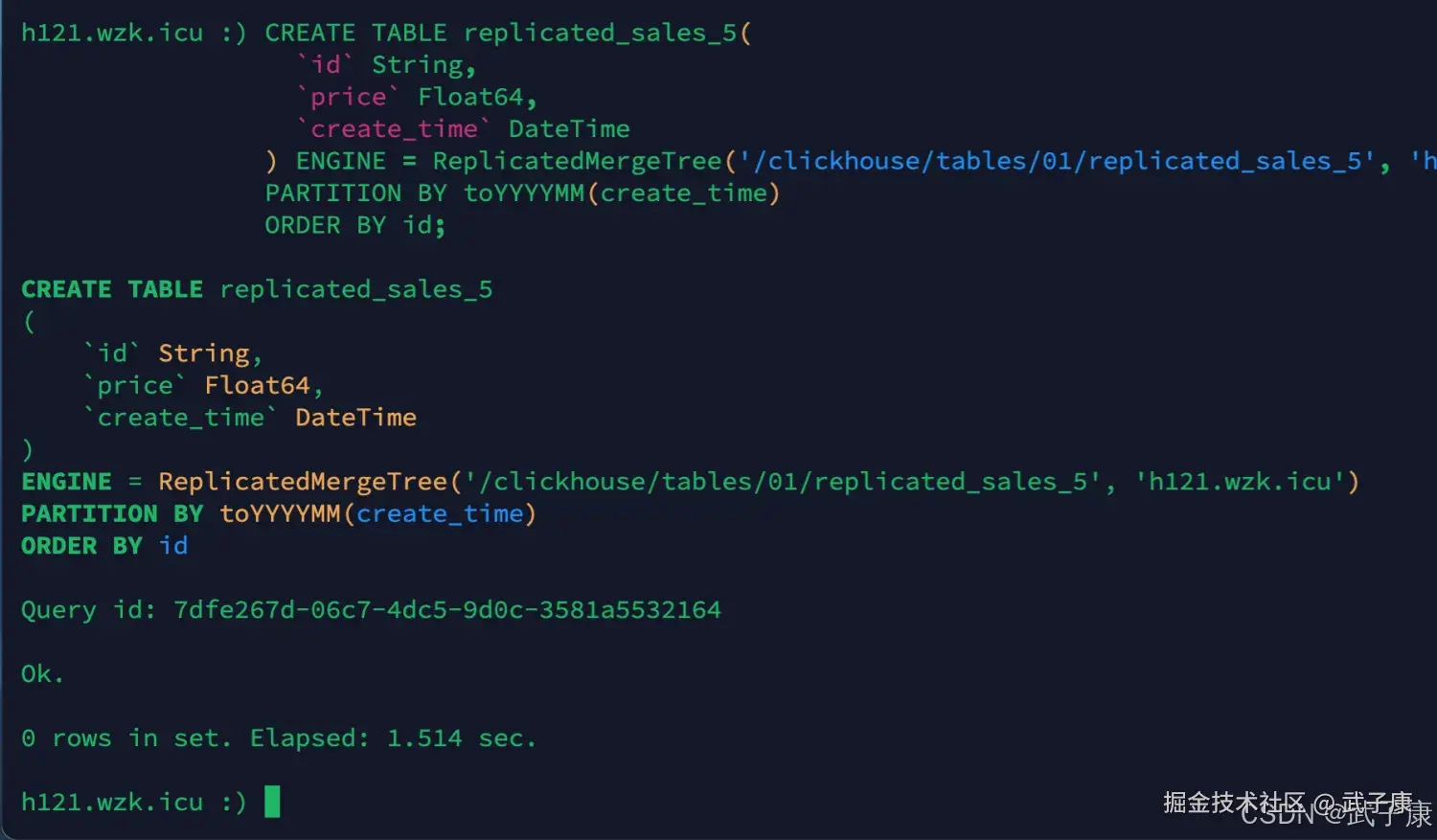) ENGINE = ReplicatedMergeTree('/clickhouse/tables/01/replicated_sales_5', 'h121.wzk.icu')