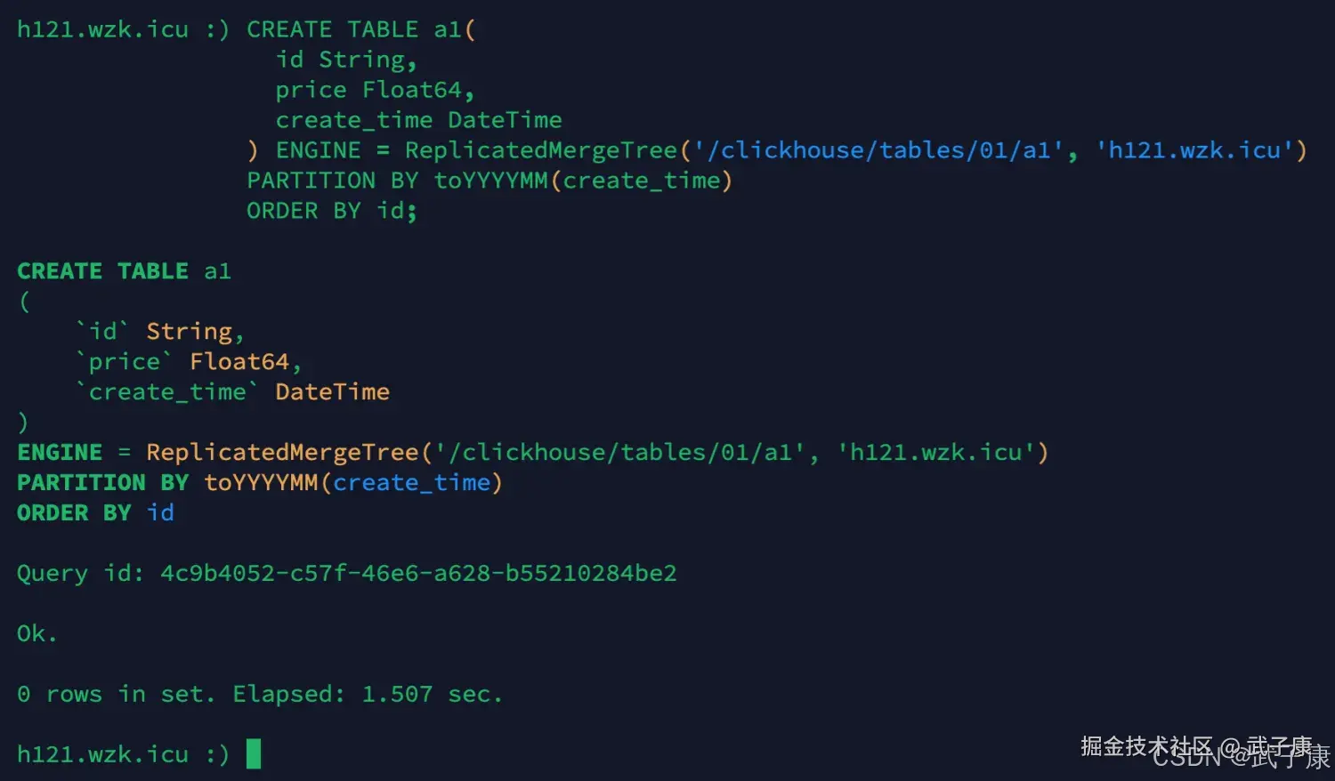 ) ENGINE = ReplicatedMergeTree('/clickhouse/tables/01/a1', 'h121.wzk.icu')