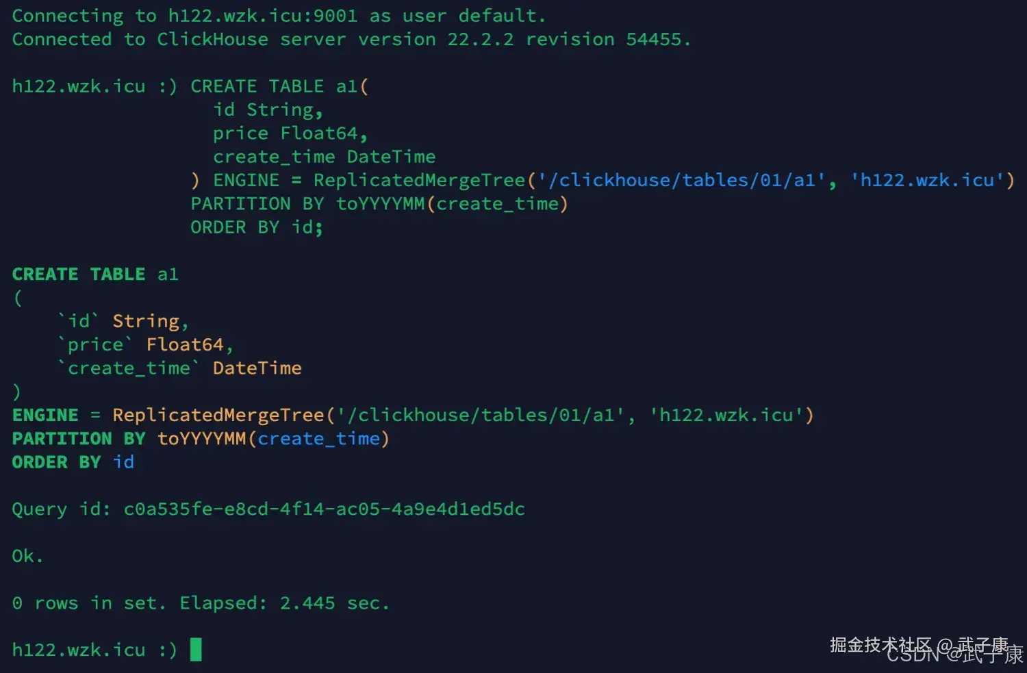 ) ENGINE = ReplicatedMergeTree('/clickhouse/tables/01/a1', 'h122.wzk.icu')