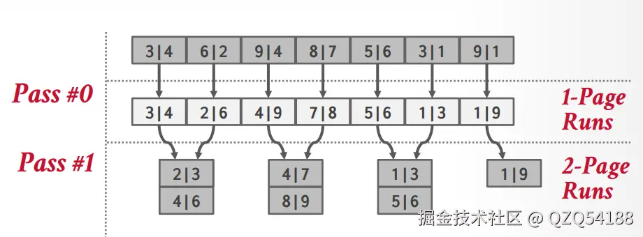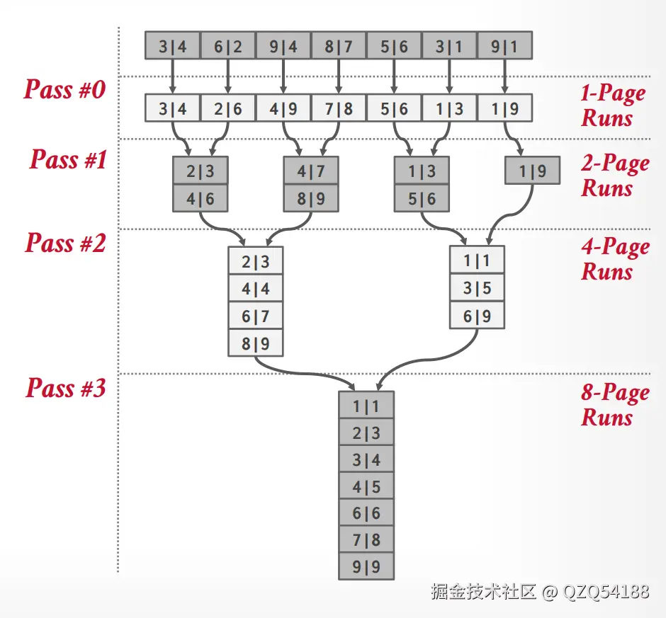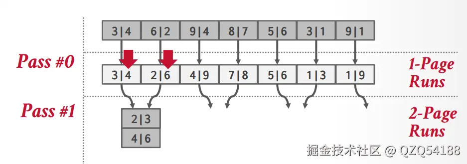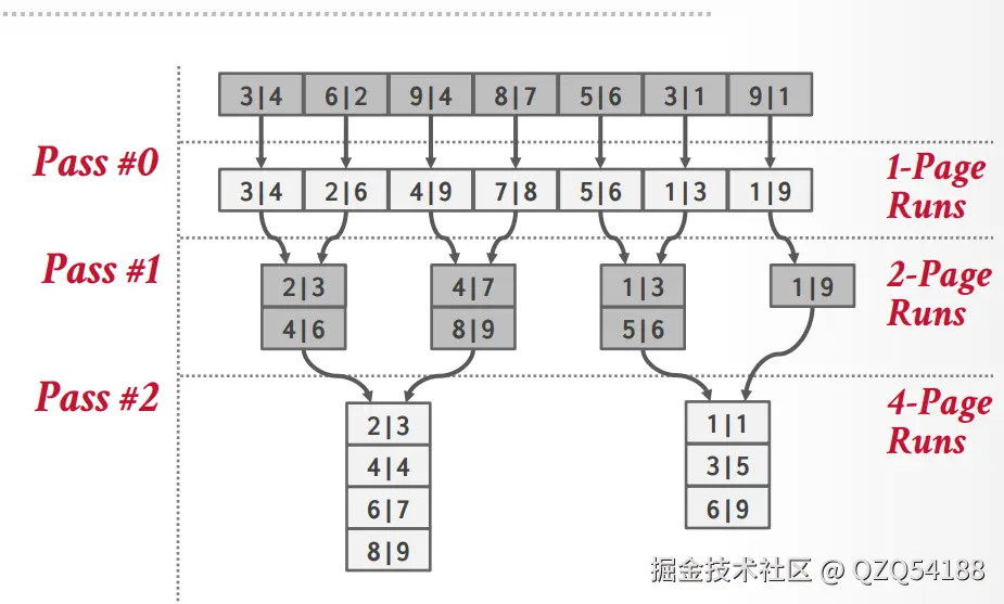 排序完之后,磁盘中的临时文件就是整体有序的状态了,可以逐个page读取。上面是15445课程ppt中的示例,还可以参考如下链接中的示例:Example of Two-way Sorting,Example of multiway Sorting。
