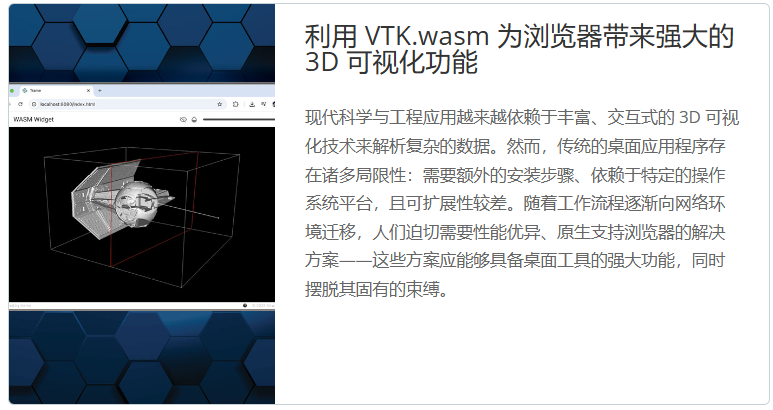 通过将 Visualization Toolkit (VTK) 编译为 WebAssembly,VTK.wasm 实现了在浏览器中直接进行高性能、交互式的 3D 可视化。这不仅提升了 VTK 的灵活性------它原本就已经支持 C++ 和 Python 语言------还使其能够被现代网页环境所使用。