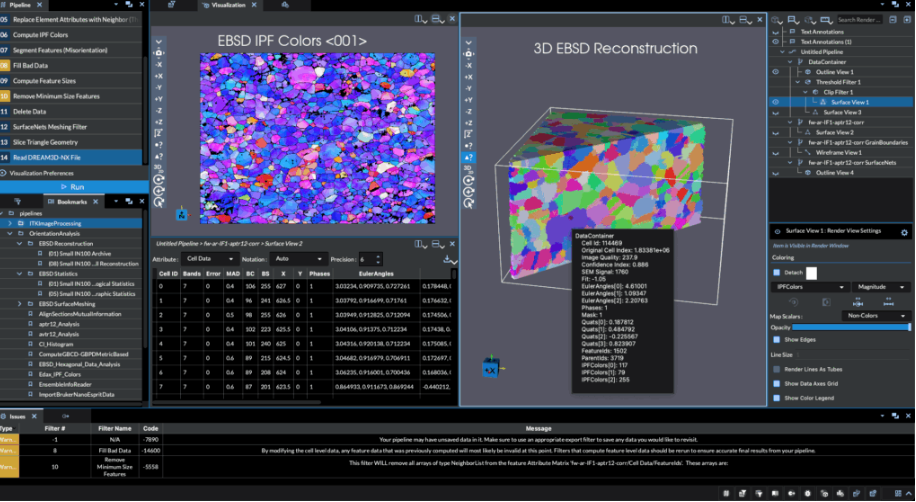 DREAM3D-NX是一个功能强大的平台,专门用于处理和分析来自各种来源的微观结构数据,这些数据包括通过电子背散射衍射(EBSD)、X射线断层扫描以及连续切片技术获得的样本信息。通过在DREAM3D-NX中集成可视化工具包(VTK),该平台的性能得到了显著提升,现在它提供了一套全面的可视化与分析工具。