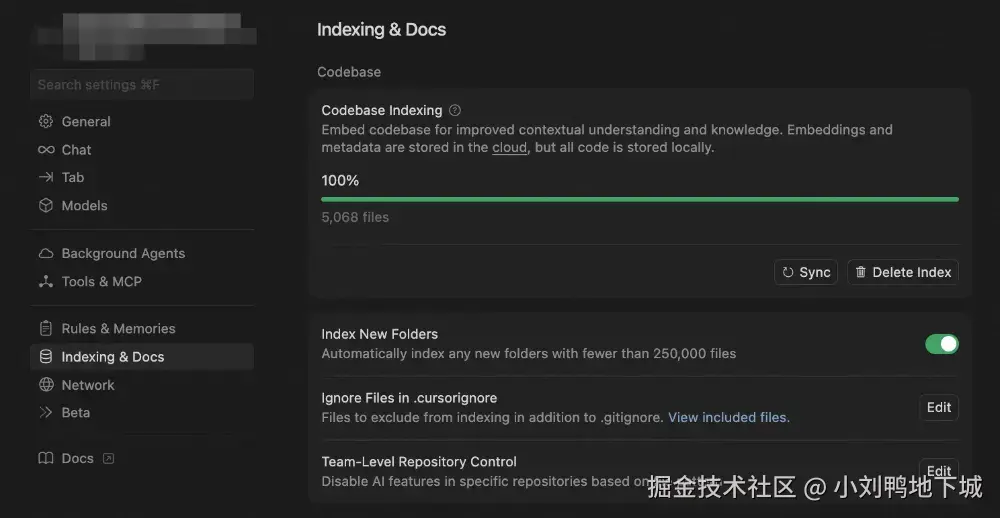 在用户导入项目时,Cursor 会启动一个 Codebase Indexing 流程,它的进度可以在 Preference - Cursor Settings - Indexing & Docs 中看到。