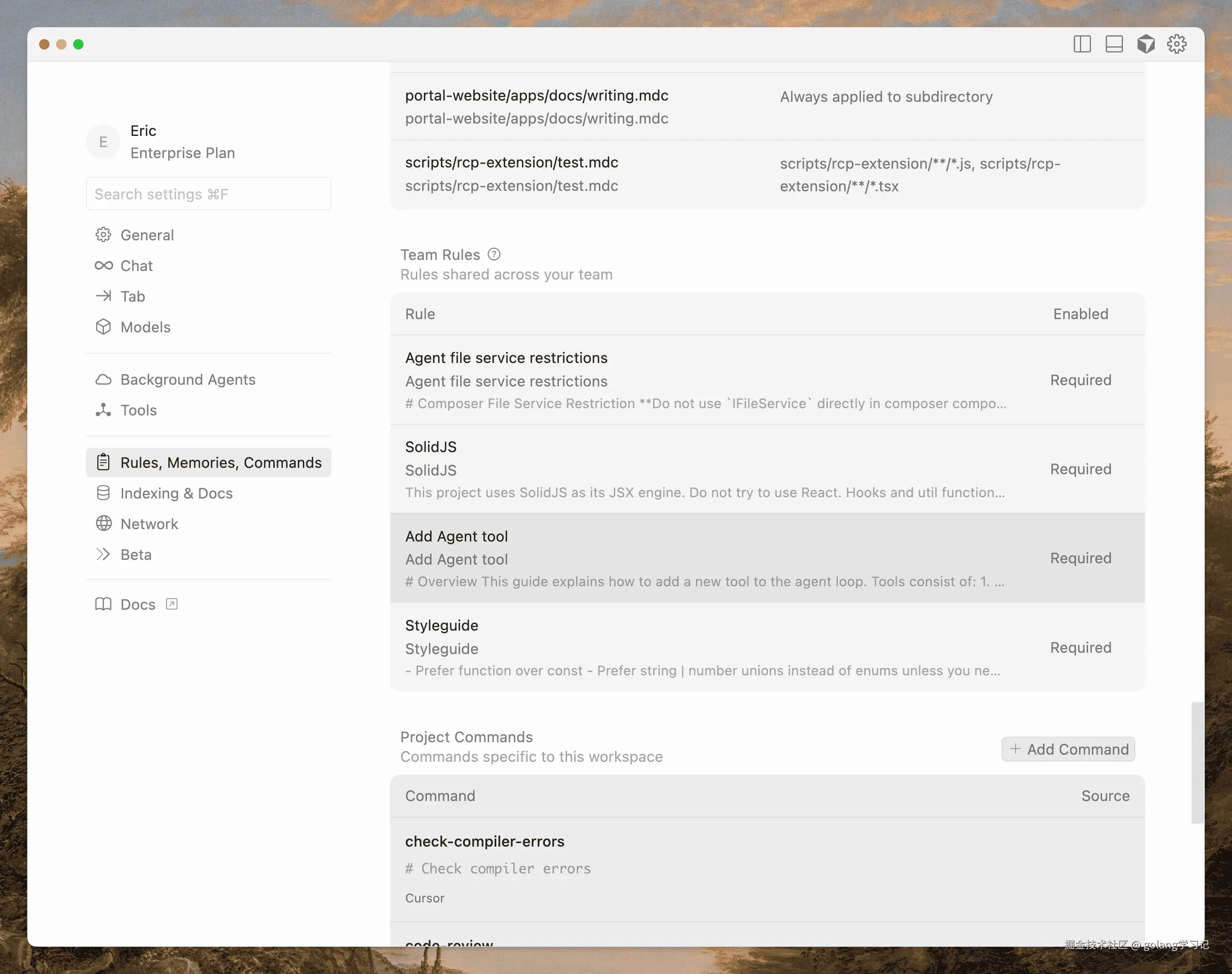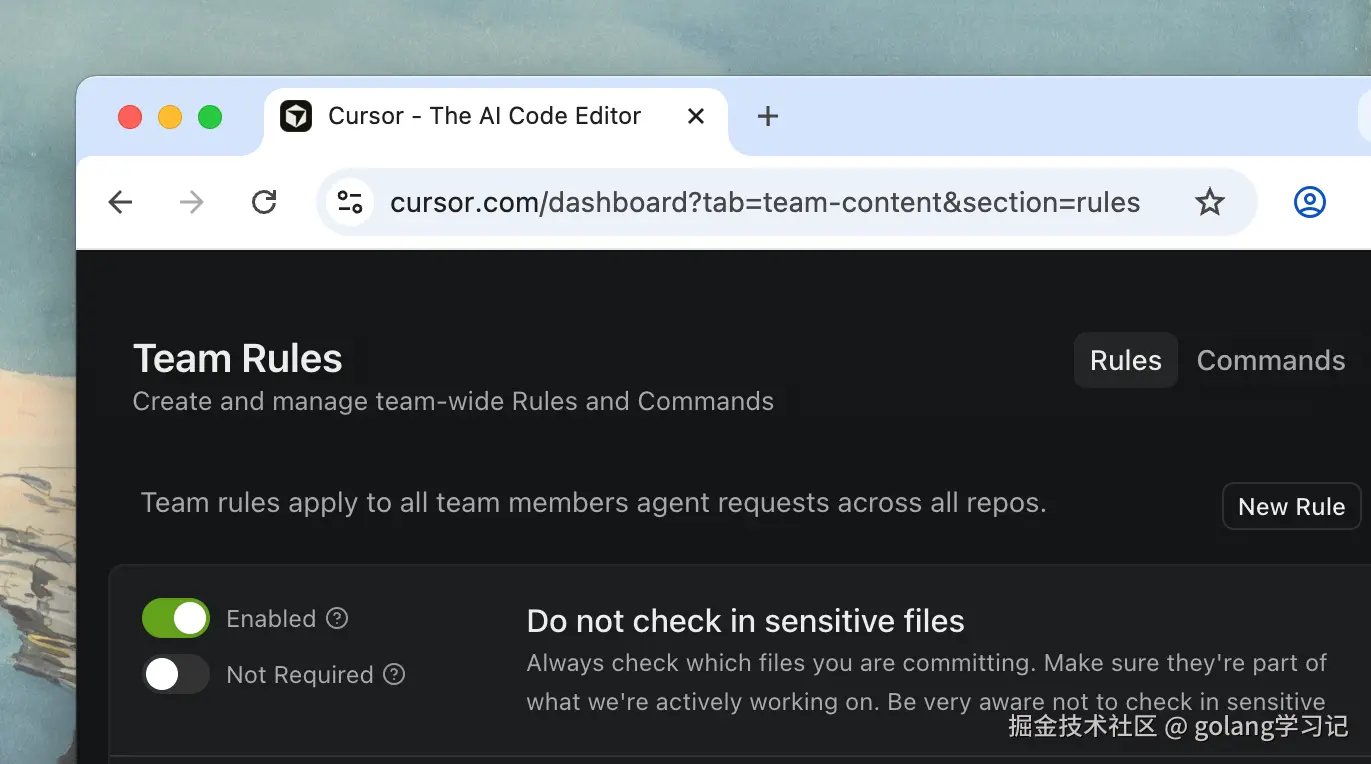 - 管理员可在 Cursor 仪表盘定义自定义命令与规则;