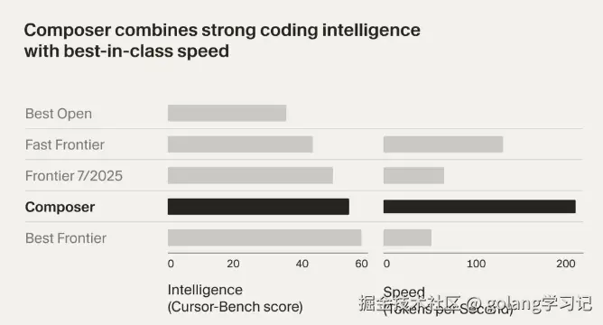 Composer 作为cursor自己的大模型,虽然智能程度不敌 GPT-5 等最佳前沿模型,但速度确实遥遥领先,达到了同等智能模型的 4 倍。