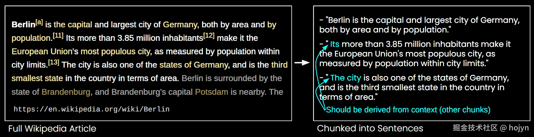 在下图中,一篇维基百科文章被分成句子块。你可以看到像"its"和"the city"这样的短语都指代"Berlin",而"Berlin"只在第一句中出现。这使得嵌入模型更难将这些引用与正确的实体联系起来,从而产生较低质量的向量表示。