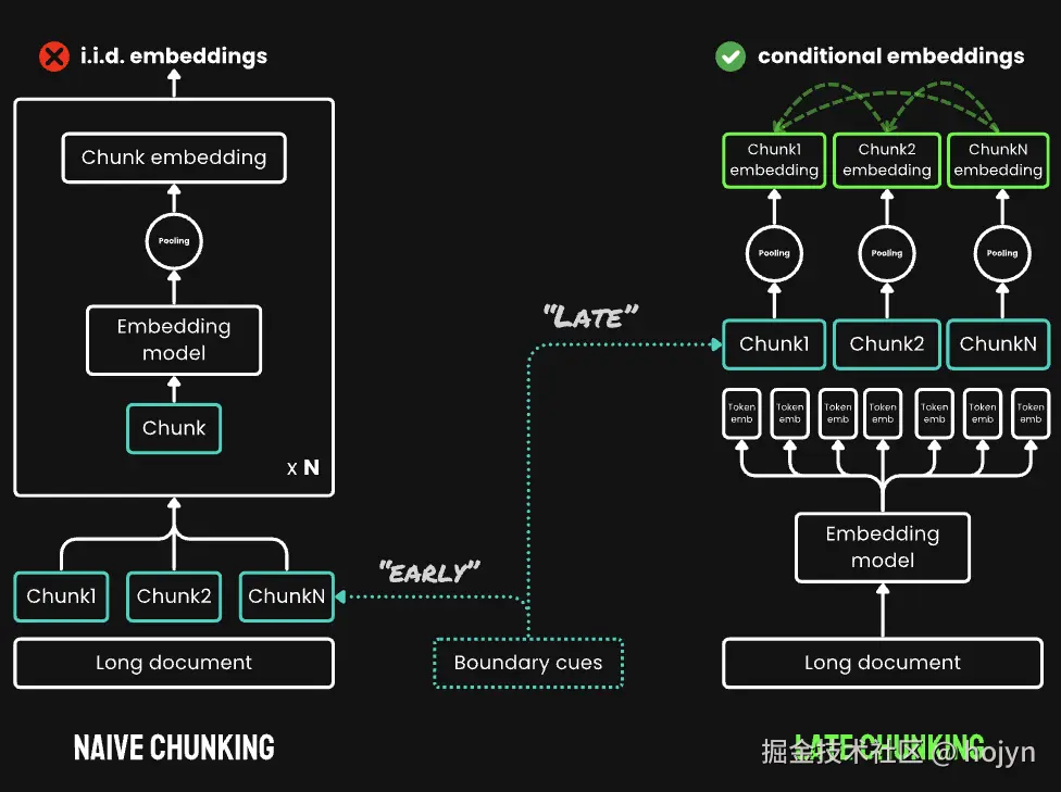 与传统的先分块再嵌入的模式不同,Late Chunking创建了一组块嵌入,其中每个嵌入都"以"前面的嵌入为条件,从而为每个块编码更多的上下文信息,然后再进行分块,这就是其名称中"Late"的由来。