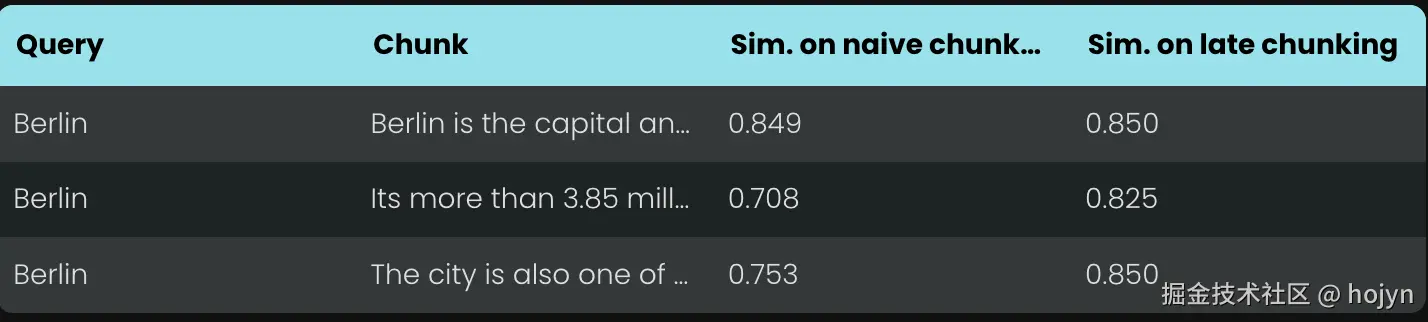 当对上述维基百科示例应用延迟分块时,你可以立即看到语义相似度的提升。例如,在维基百科文章中"这座城市"和"柏林"的情况下,表示"这座城市"的向量现在包含了将其链接到之前提到的"柏林"的信息,这使得它在涉及该城市名称的查询中能获得更好的匹配效果。