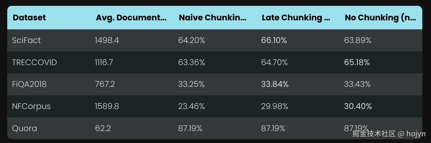 除此之外,实验还发现一些有趣的现象:应用于固定 token 边界的 late chunking 的表现优于具有语义边界提示的传统分块。这意味着虽然late chunking策略并非解决"如何寻找更好分块边界?"的问题,但是在使用较差的分块边界具有韧性。需要注意的是,对不良边界具有弹性并不意味着我们可以忽视它们------它们对人类和 LLM 的可读性仍然很重要。