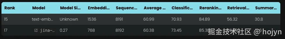 在 2023 年 10 月jina ai发布了一个具有8k上下文长度的开源嵌入模型,早期的或者小型的嵌入模型通常只有512tokens,和openai同类型的embedding模型对比如下: