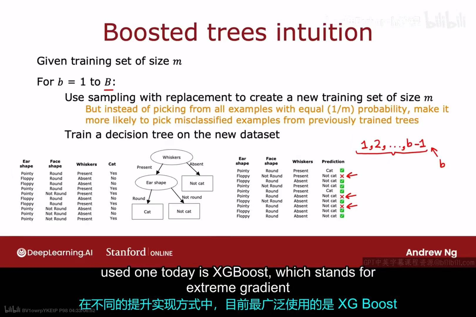 - 接着,它训练第二棵树,这棵树会更加关注那些在第一步中被分错的"困难"样本。