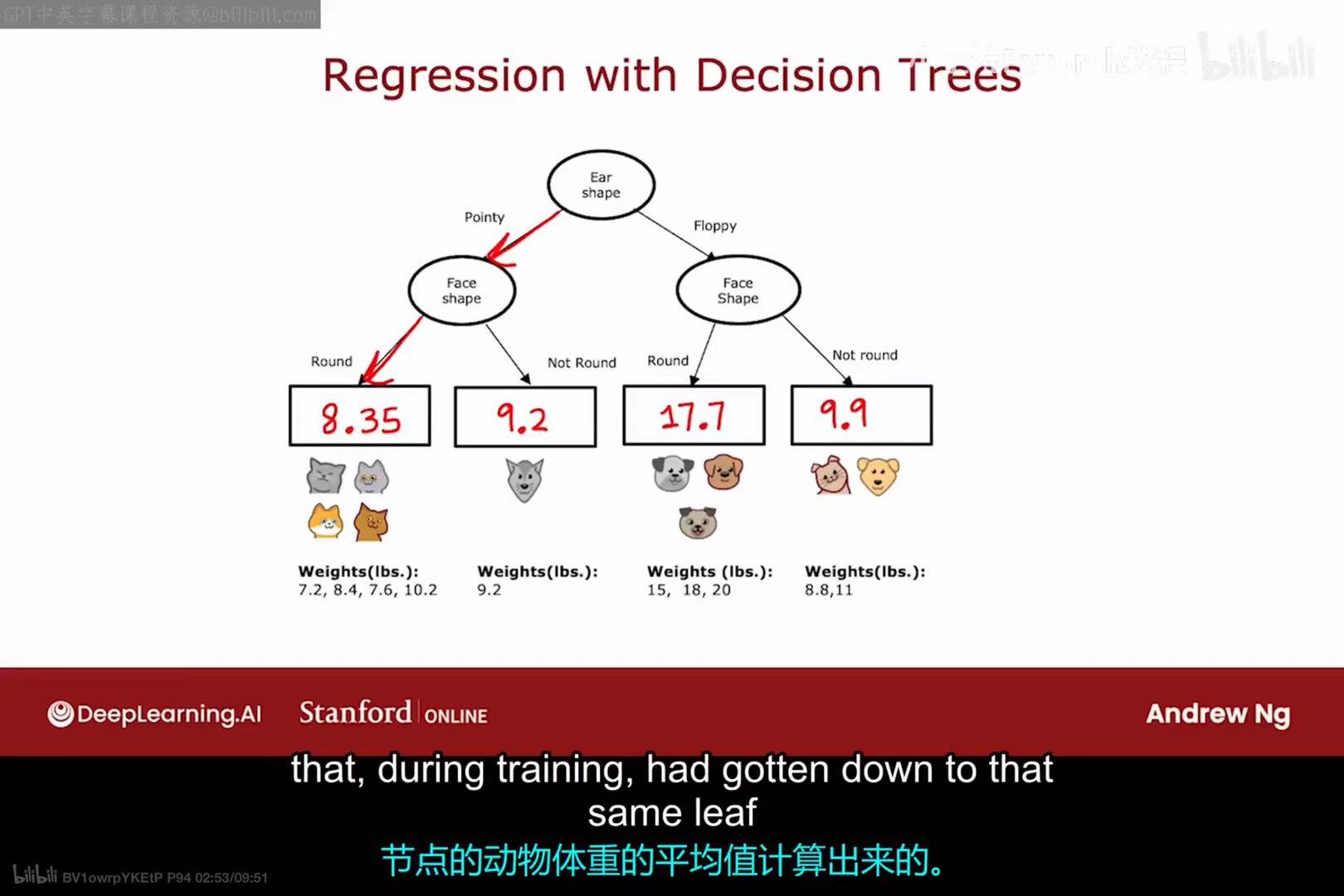 y的平均值,会被作为这个叶节点的预测值。例如,左下角的叶节点包含4个训练样本,它们的体重分别是7.2, 8.4, 7.6, 10.2,其平均值为8.35,因此该叶节点的预测值就是8.35。