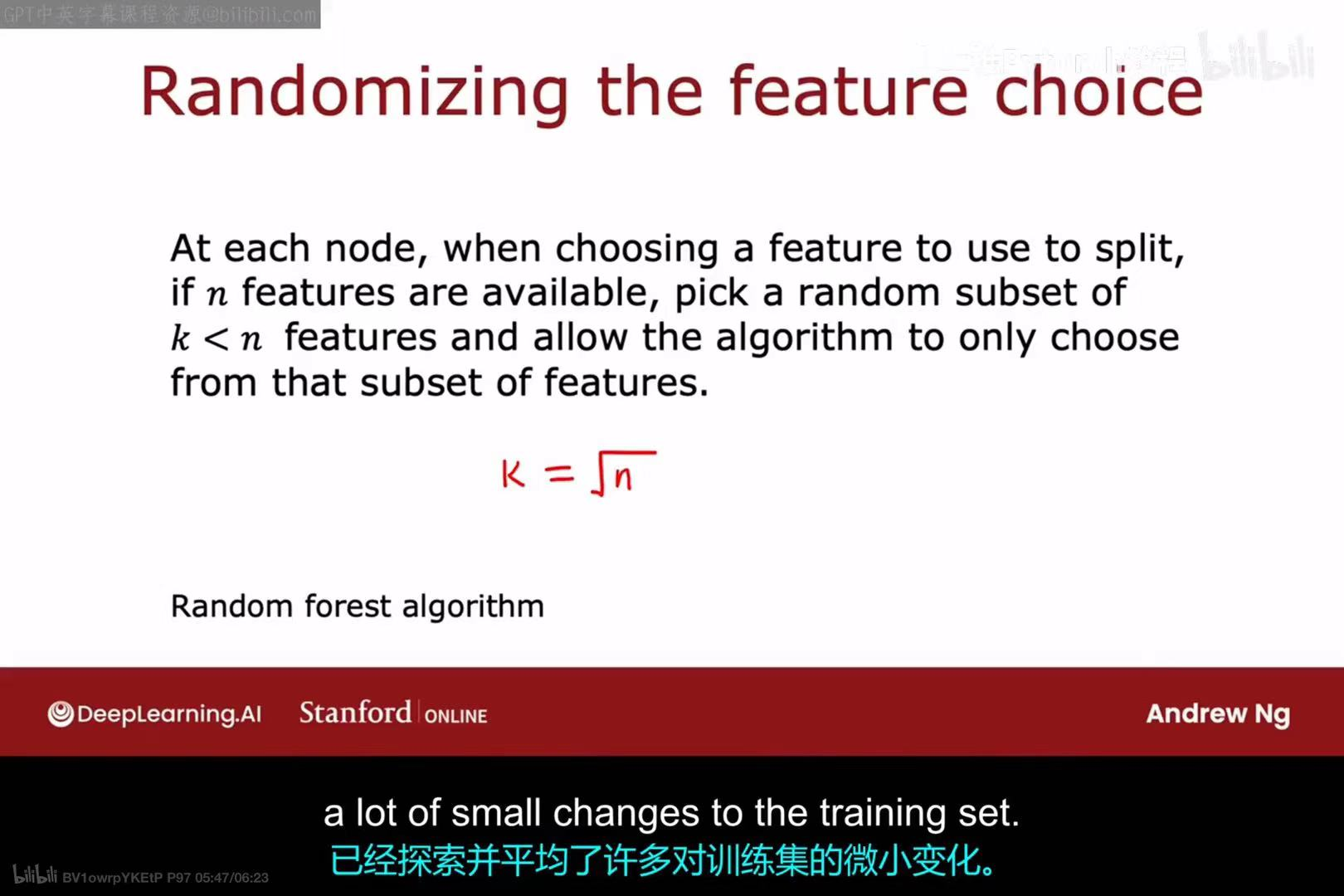 n个特征中,随机选择一个大小为k的子集 (其中k < n,一个常见的经验法则是k = sqrt(n))。 - 然后,算法只在这个