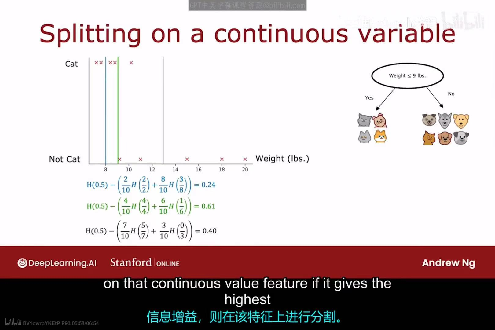 - 最终,算法会选择那个能够提供最高信息增益的分割点作为这个连续特征的最佳分割策略。例如,如果"Weight <= 9"这个分割带来的信息增益高于其他所有可能的分割,也高于其他所有特征,那么它就会被选为当前节点的分裂标准。