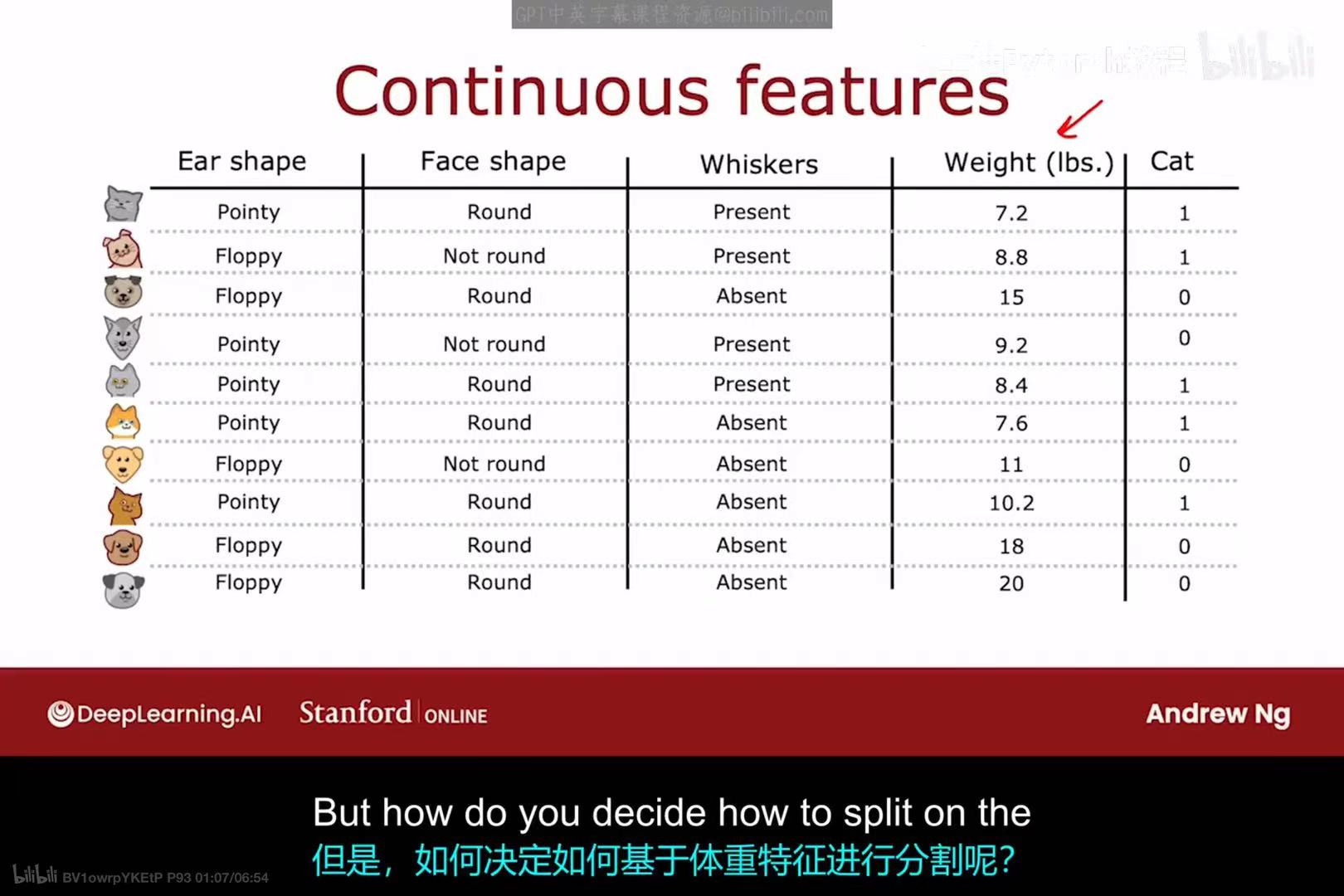 除了分类特征,数据集中也常常包含连续特征(Continuous features),例如上图中新增的"Weight (lbs.)"(体重,单位为磅)。决策树同样可以处理这类特征。