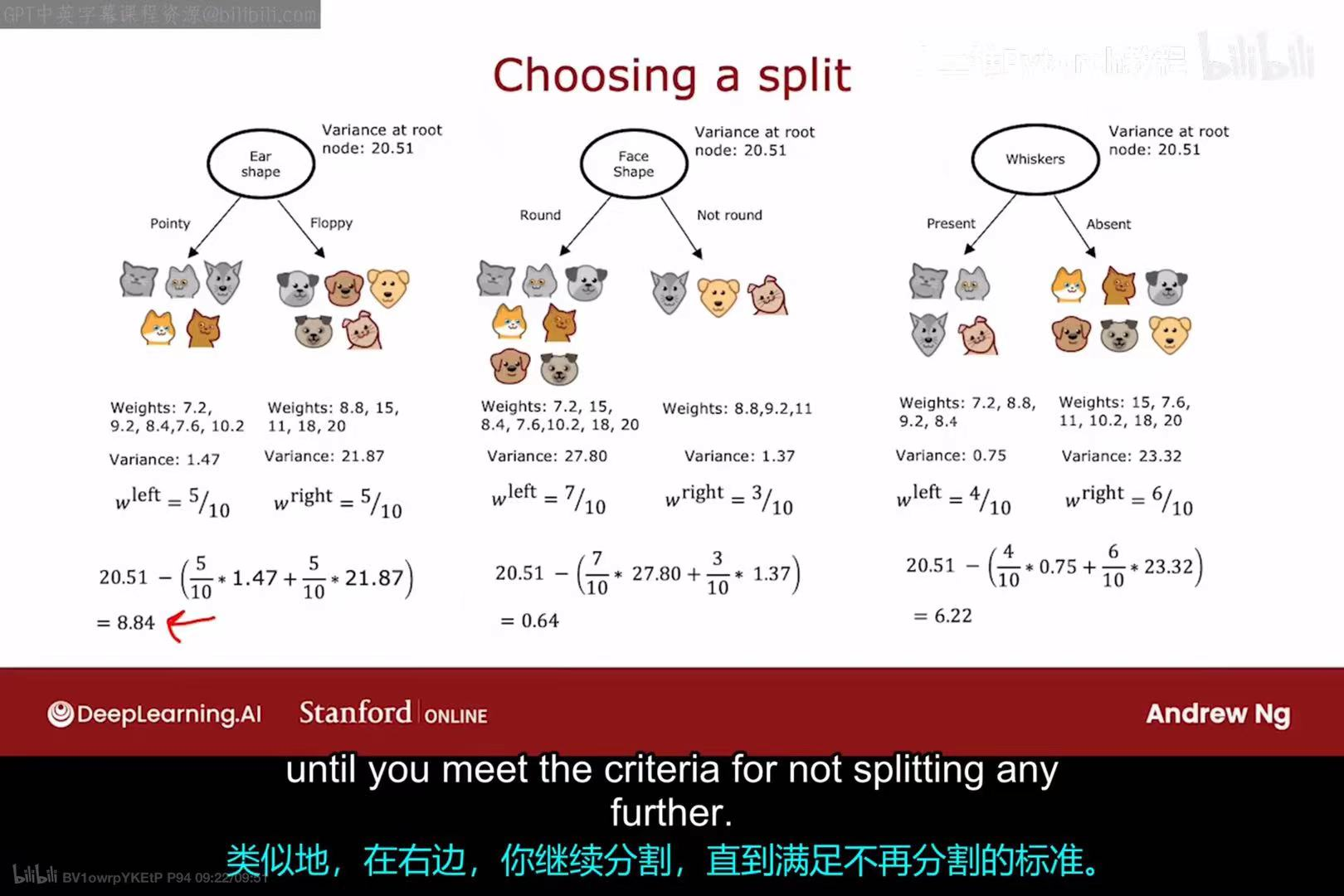 - 因为"Ear shape"带来的方差缩减最大,所以算法选择它作为根节点的分裂特征。这个过程会递归地进行下去,直到满足停止分裂的条件。