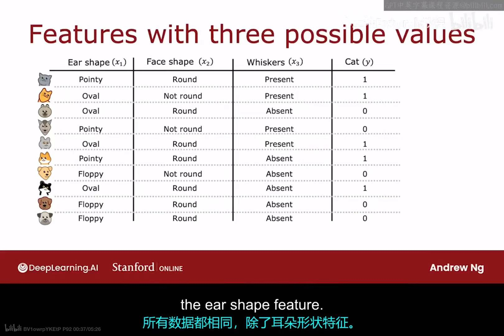 在之前的例子中,我们的分类特征都只有两个可能的值(例如,"Pointy" vs "Floppy")。但如果一个特征有三个或更多的可能值呢?例如,上图中的"Ear shape"(耳朵形状)特征现在有三种可能的值:"Pointy"(尖耳朵)、"Oval"(椭圆形耳朵)和"Floppy"(软塌耳朵)。